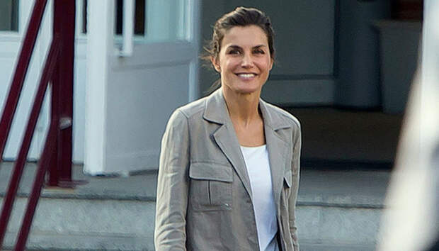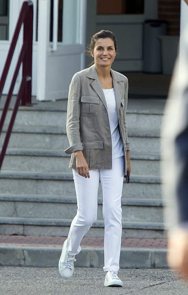 Несмотря на высокий статус королевы Испании Летиция, в первую очередь, остается мамой двух прелестных дочек: 12-летней Леонор и 11-летней Софии. Поэтому отложив все монаршие дела утром она отвозит детей в школу и выбирает для этого повседневный образ. Фотографы подловили королеву около учебного заведения, где учатся ее дети, без грамма макияжа, в белых джинсах, легком жакете в стили милитари и кроссовках.