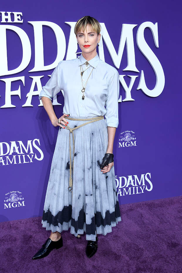 Мы не перестаем восхищаться новой прической Шарлиз Терон. В очередной раз она продемонстрировала новый имидж на премьере анимационного фильма "Семейка Адамс", где она озвучила несравненную Мортишу Аддамс. На премьере в Лос-Анджелесе актриса появилась в комплекте из юбки плиссированной юбки с эффектом тай-дай и голубой рубашке, застегнутой на все пуговицы.