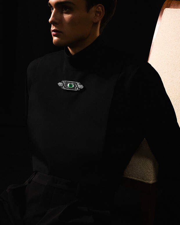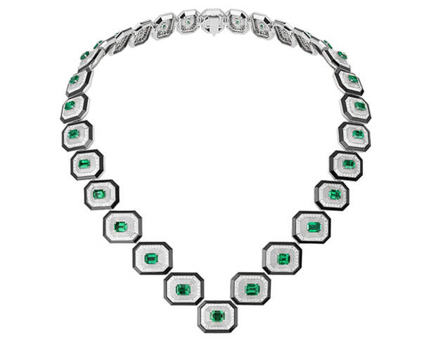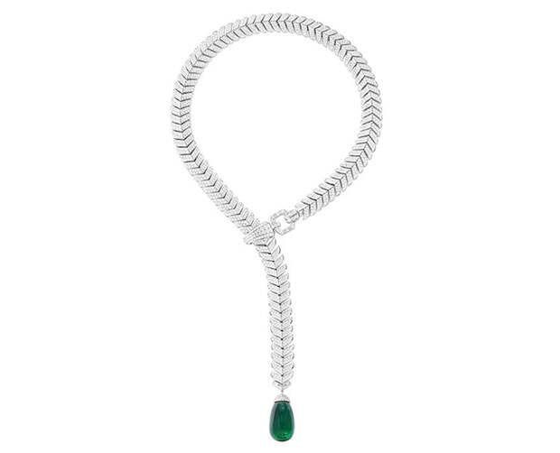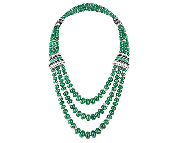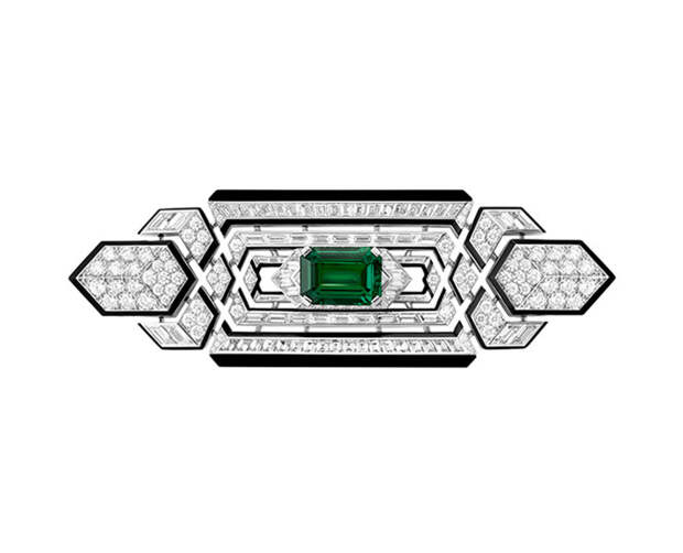Открывает энциклопедию ар-деко Boucheron колье-галстук Cravate Émeraude. Шелк превращается в белое золото с бриллиантовым паве, к которому крепится съемная брошь с ониксом, черным лаком и 8-каратным изумрудом. Это тоже своего рода декларация свободы. Клиентки Boucheron вольны носить произведения высокого ювелирного искусства как им угодно: дополнять мужской костюм драгоценным «галстуком» или крепить брошь по горизонтали под воротником.