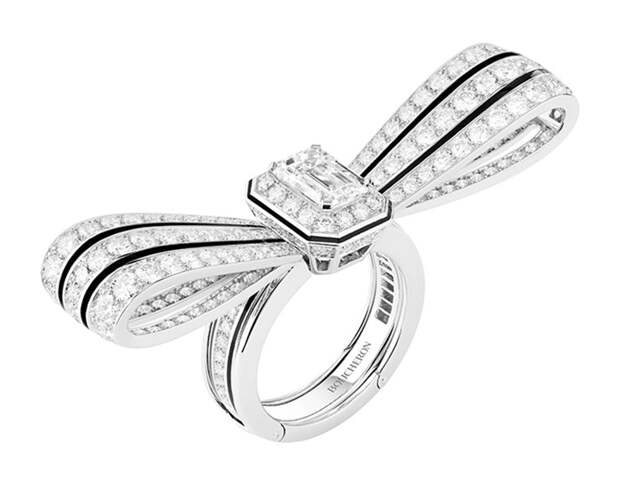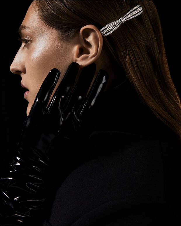 Мини-коллекция Noeud Diamants позаимствовала свой главный декоративный элемент, бант, у барочной эстетики. Игривая деталь благодаря вытянутым пропорциям и строгому сочетанию бесцветных бриллиантов с черной эмалью также подходит для деловых и утонченных black-tie образов: носите украшение как коктейльное кольцо или классический солитер (бант легко снимается, оставляя в центре внимания бриллиант весом 1,5 карата с черной окантовкой), или же дополняйте им прическу.