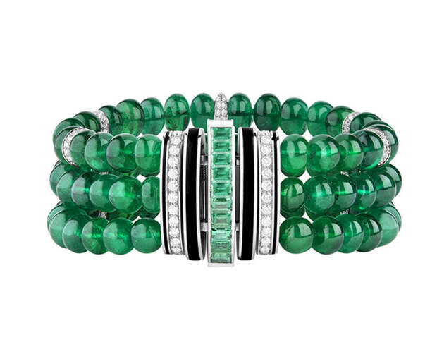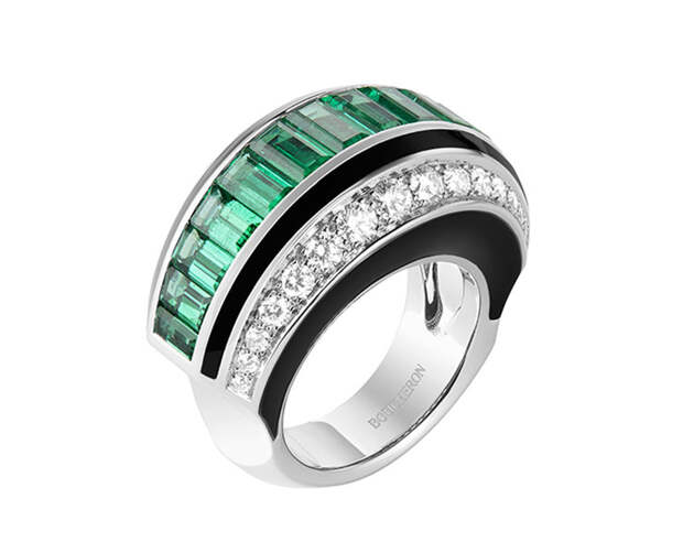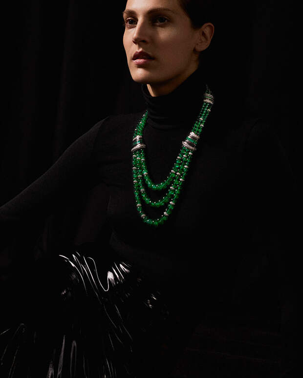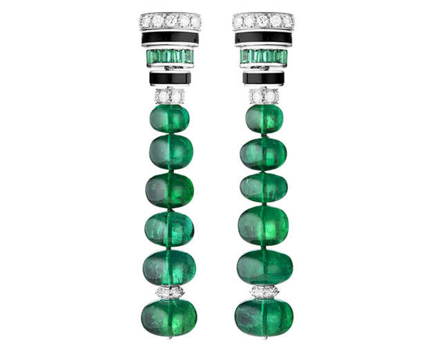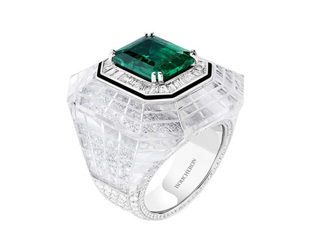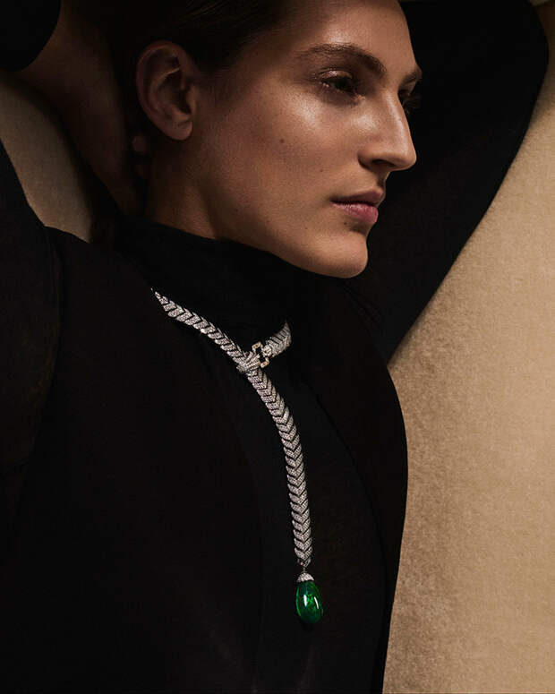 Следующая глава новой истории Boucheron полностью посвящена изумрудам. Они солируют в колье-пластроне с 220 бусинами общим весом 1071.97 карат. Стилистика ар-деко многое взяла от Востока и обыграла эти коды на западный манер,: так, колье Plastron Émeraudes отсылает к украшениям, которые Дом создавал для махараджи Патиала. И, конечно, Шуан не забыла о том самом Plume de Paon. Перо в высокоювелирном исполнении украшено в этом сезоне 61.35-каратной изумрудной каплей на бриллиантовой ленте, длину которой можно регулировать.