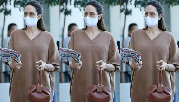 Любовь к монохрому и на этот раз не оставила Энджи. Она дополнила свой элегантный выход сумкой Gabriela Hearst Nina, прозрачными солнцезащитными очками-авиаторами и неизбежным аксессуаром в условиях нового времени - защитной маской, скрывающей половину лица.