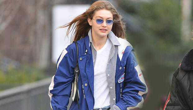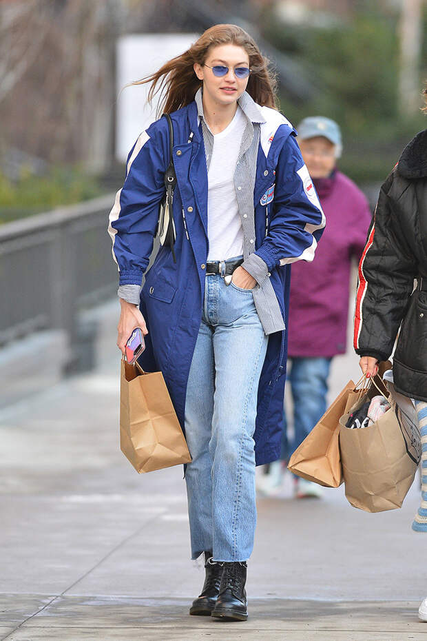 Джиджи Хадид создала новую линейку спортивной одежды и обуви для бренда Reebok. 4 февраля в Нью-Йорке прошла презентация этой коллекции. Папарацци удалось подловить топ-модель незадолго до ответственного ивента: она отправилась за необходимыми покупками в белой футболке, синем плаще Colmar ниже колена, грубых черных ботинках и светлых прямых джинсах с высокой талией (такую модель просто обожают звезды стритстайла). Ну и конечно, куда же без микроочков - на этот раз знаменитость подобрала их в тон к верхней одежде. Образ вышел теплым, универсальным, но при этом стильным.