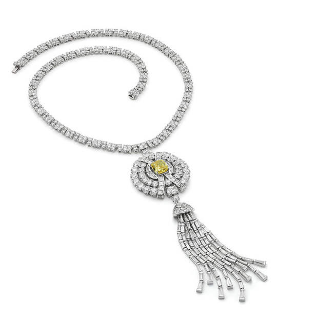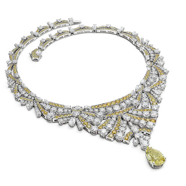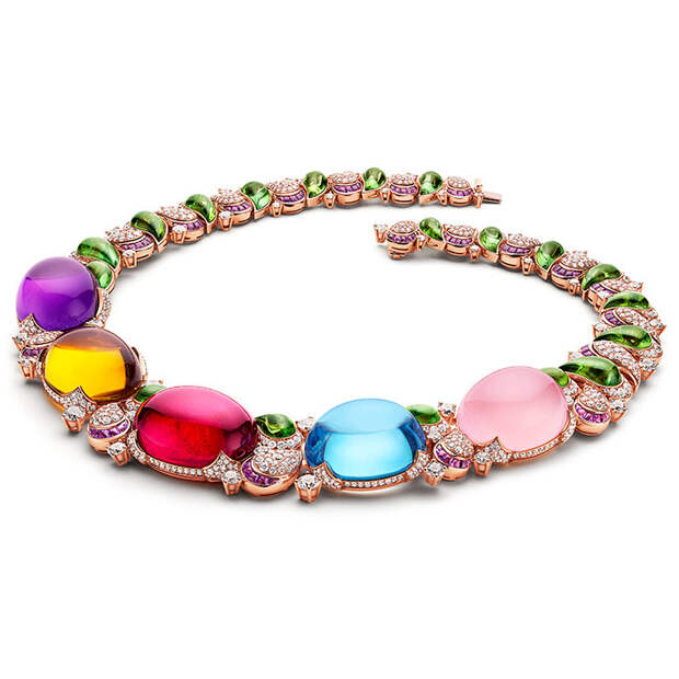 Среди «звезд» Magnifica — невероятная шпинель в 131.24 карата, четвертая в мире по весу и при этом лучшая по качеству, а также 93-каратный кабошон колумбийского изумруда, который бережно хранит в своей пасти змея, обвивающая колье. Кроме них — пять овальных турмалинов параиба огранки «кушон», самых редких драгоценных камней в мире, общим весом около 500 карат.