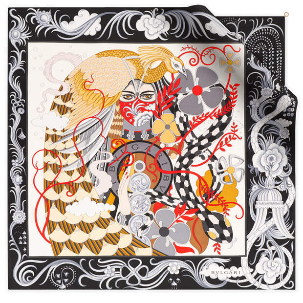 Орацио Стази, дизайнер текстиля Bvlgari, создал коллекцию шелковых платков, посвященную мифической Саломее, которую итальянский бренд справедливо с собой ассоциирует. Смелые, обольстительные и таинственные – вот какими видятся поклонницы Bvlgari. На каждом платке можно рассмотреть все знаковые для марки образы: змейки