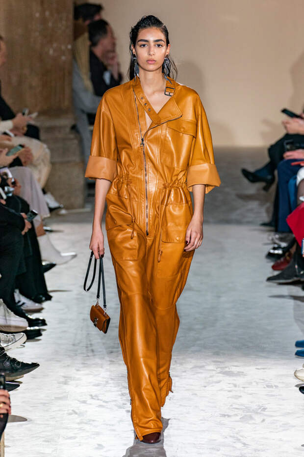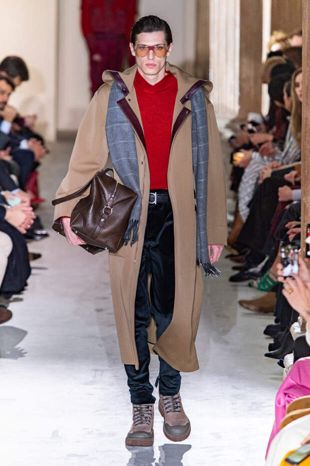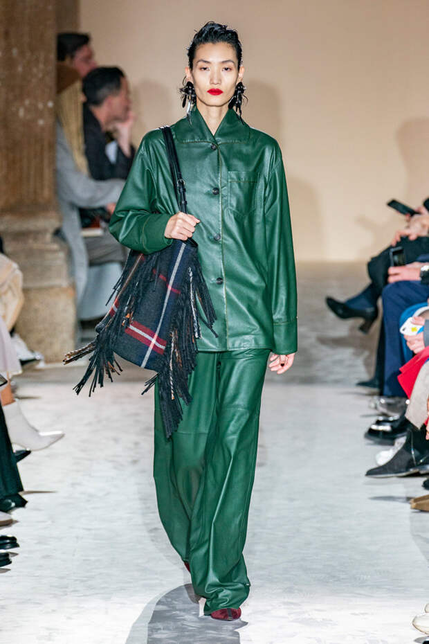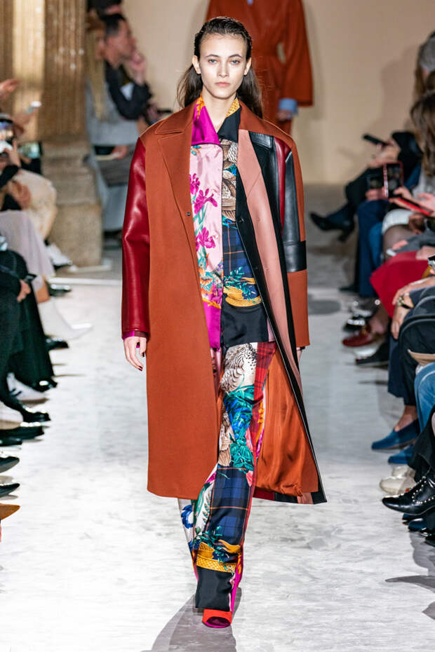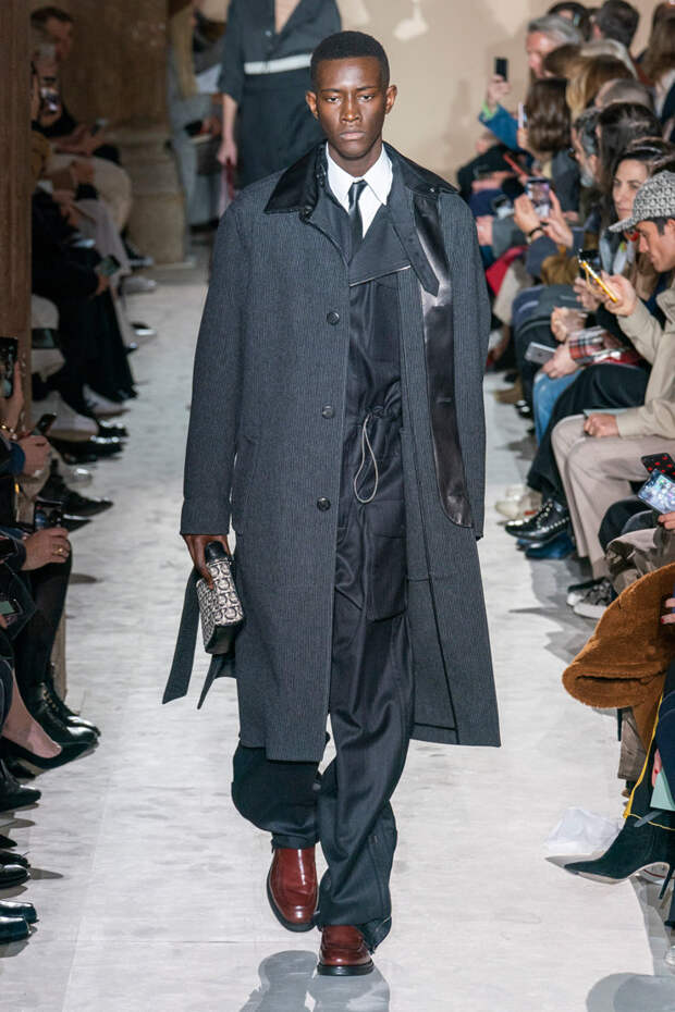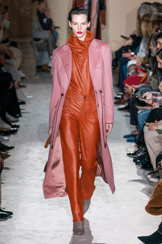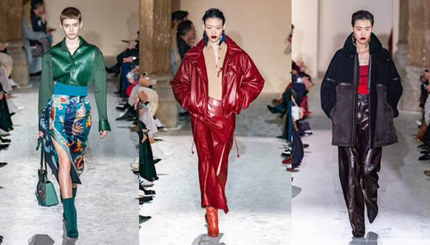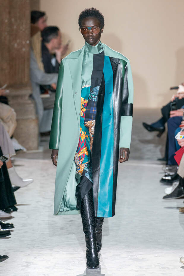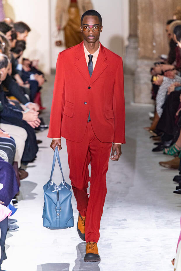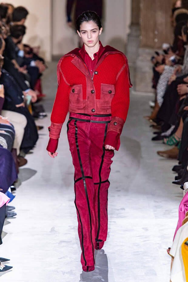 "Музами" дизайнера стали красочные замшевые босоножки на платформе 1942 года. Их расцветка и перенеслась в коллекцию — какие-то другие цвета он, конечно, добавил, но самой идее мы все равно обязаны босоножкам. Не было бы их — не было бы и голубого кожаного худи, и горчичных брючных костюмов, и винных байкерских штанов, и темно-зеленых пижам из кожи. Последние, конечно же, не для спальни, а для выходов в свет.В мужской половине, за дизайн которой отвечает другой дизайнер, Гийом Мейян, все было куда спокойней — и по цветам, и по самому набору вещей. Это даже хорошо: классика на то и классика, что хороша всегда.