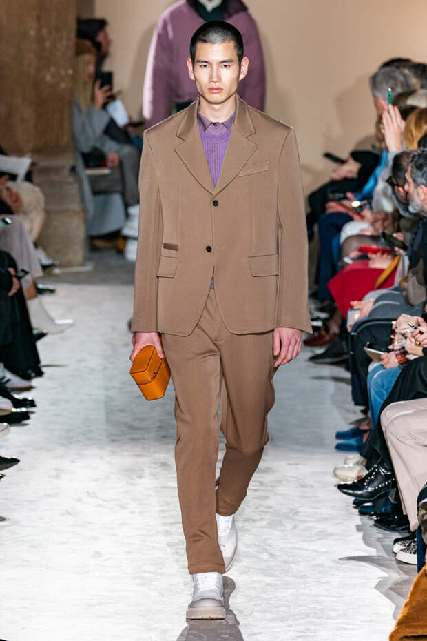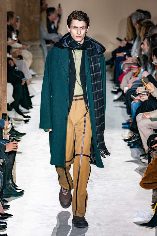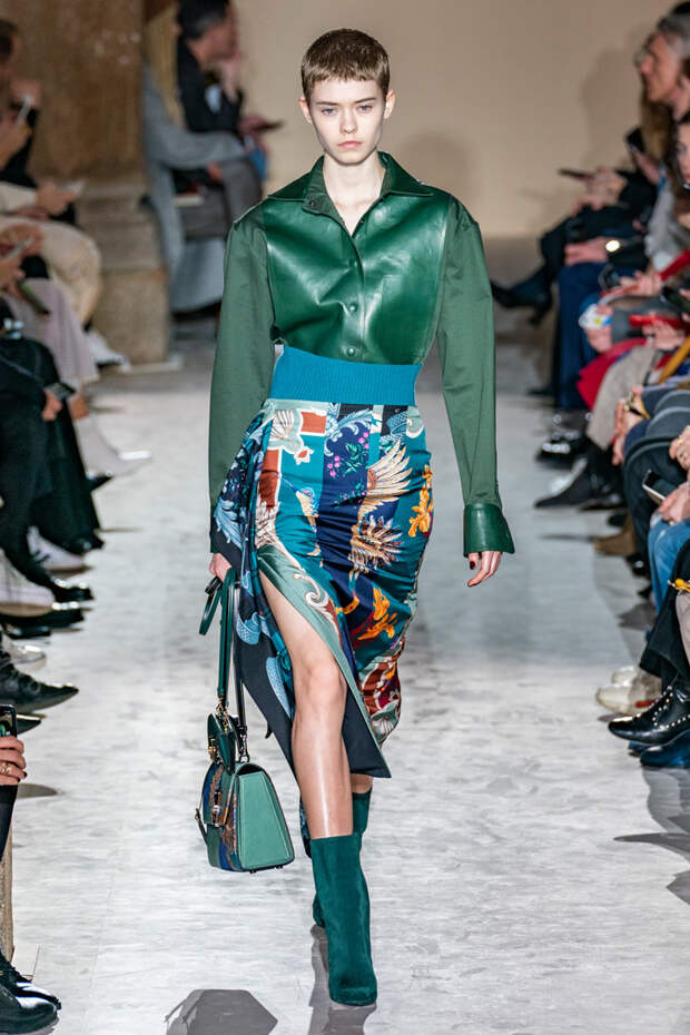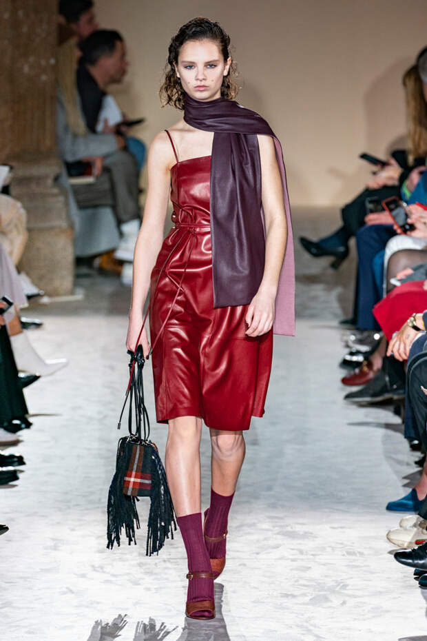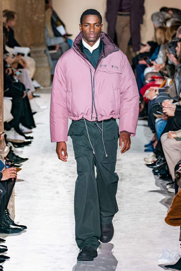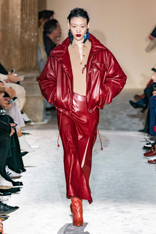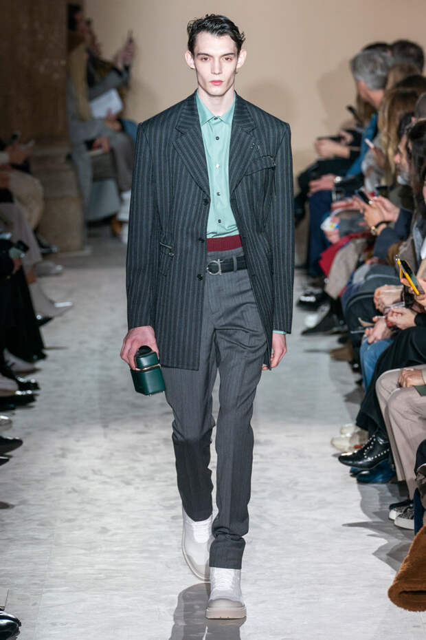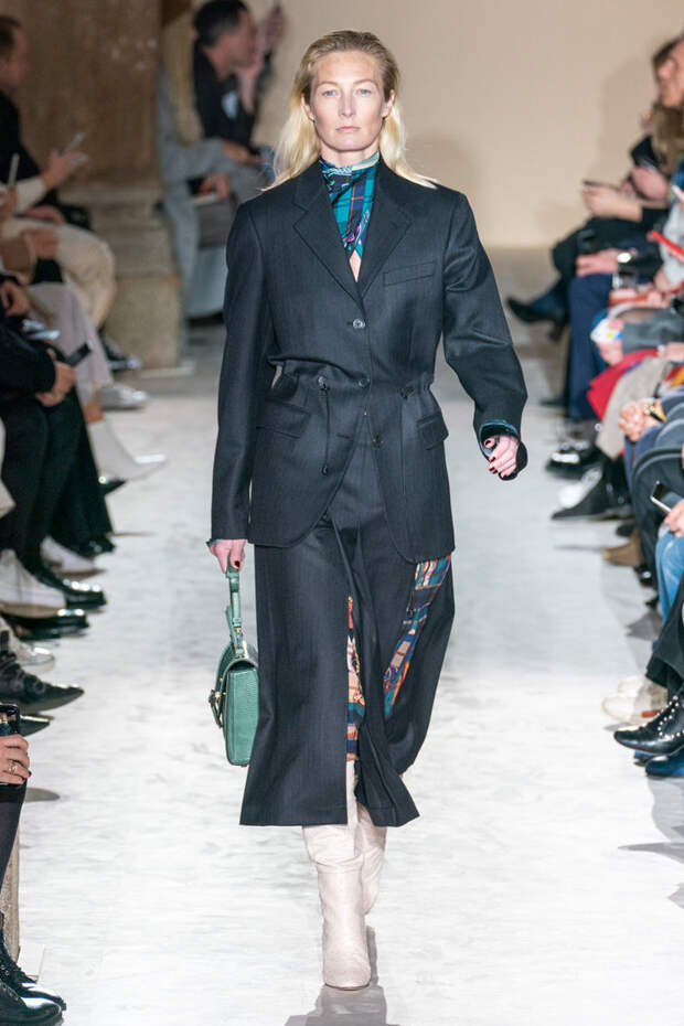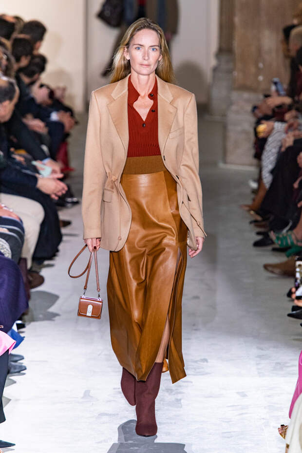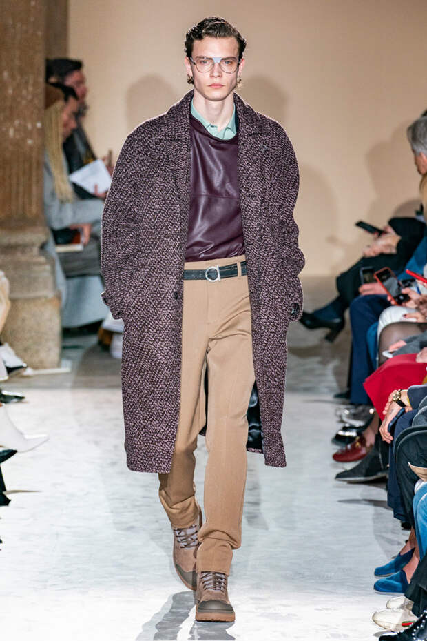 "Музами" дизайнера стали красочные замшевые босоножки на платформе 1942 года. Их расцветка и перенеслась в коллекцию — какие-то другие цвета он, конечно, добавил, но самой идее мы все равно обязаны босоножкам. Не было бы их — не было бы и голубого кожаного худи, и горчичных брючных костюмов, и винных байкерских штанов, и темно-зеленых пижам из кожи. Последние, конечно же, не для спальни, а для выходов в свет.В мужской половине, за дизайн которой отвечает другой дизайнер, Гийом Мейян, все было куда спокойней — и по цветам, и по самому набору вещей. Это даже хорошо: классика на то и классика, что хороша всегда.