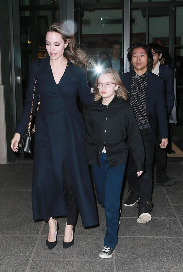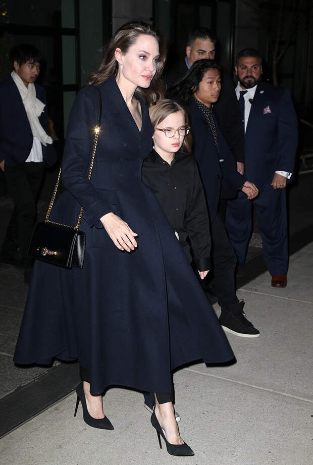 Поклонники Анджелины Джоли не нарадуются ее новым выходам. Наконец-то актриса и режиссер отложила подальше безразмерные балахоны и начала все чаще появляться на публике в женственных нарядах, подчеркивающих ее стройность и изящество. Так, 25 февраля знаменитость выбрала для прогулки с детьми элегантное иссиня-черное платье-пальто.