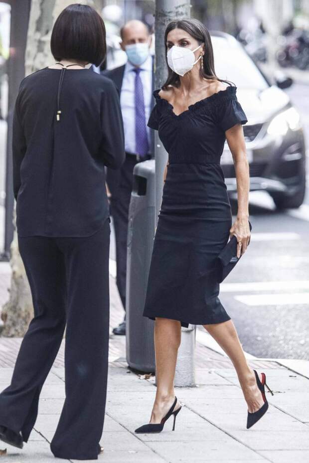 В этом образе безупречно все — от силуэта платья до модели туфель. Ее Величество выбрала черное платье-футляр со спущенной линией плеч, которое подчеркивало ее изящную фигуру. К нему она подобрала простой клатч-конверт того же оттенка и элегантные туфли-слингбэки на высокой шпильке. Из украшений на ней были лишь лаконичные золотые серьги. Настоящая королевская простота!