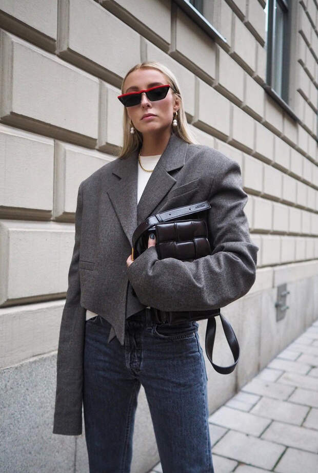 Звезды стритстайла, конечно же, не обошли стороной этот тренд. Если планируете пойти так на работу, то следует заменить топ на лаконичную водолазку. Составляя образ с пиджаками-болеро, не обязательно следовать правилу: «Чем короче верх, тем выше должна быть посадка низа», хот так вы максимально подчеркнете талию. Модницы пробуют аутфиты и с брюками с заниженной талией. Завершите ансамбль массивной обувью вроде лоферов на высокой платформе, чтобы смотрелось гармонично.
