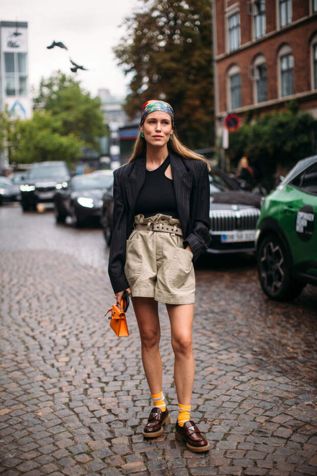 Выбирайте удлиненные модели с высокой талией и дополняйте их базовыми трикотажными топами. И, конечно, не стоит пренебрегать пиджаком-оверсайз, без которого не обходится ни один модный лук с шортами. Завершить образ помогут базовые лоферы, которые этой осенью мы продолжим комбинировать с яркими носками.