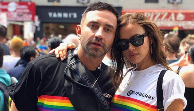 Среди прочих, Ирина Шейк, креативный директор Burberry Рикардо Тиши и Донателла Версаче. Ирина поддержала своих друзей в смелом наряде: микроскопические джинсовые шорты дополнила футболка с символикой ЛГБТ-сообщества, завязанная узлом.