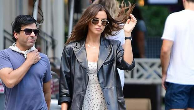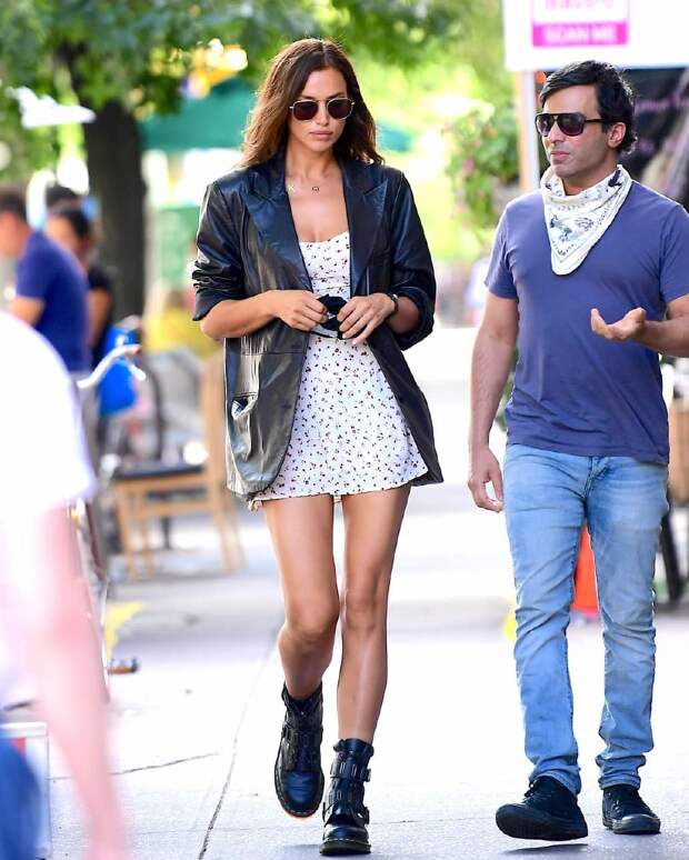 Российская супермодель Ирина Шейк появилась в Нью-Йорке в образе в стиле 90-х. В коротком платье, показывающем ее бесконечные ноги, кожанке и массивных ботинках она отправилась на маникюр.