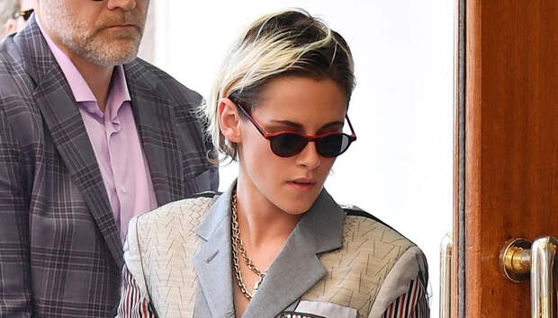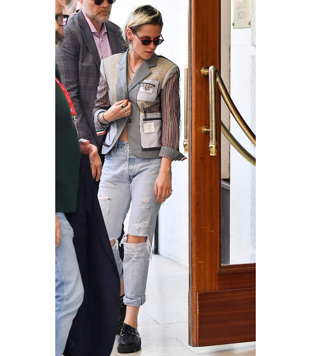 Вот и в перерывах между показами на Венецианском кинофестивале Стюарт сменила вечерние туалеты на рваные джинсы и "лоскутный" жакет Thom Browne — естественно, надетый на голое тело в паре с "грубыми" ожерельями-цепочками. Одним словом, бунтарка!