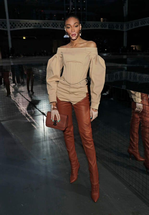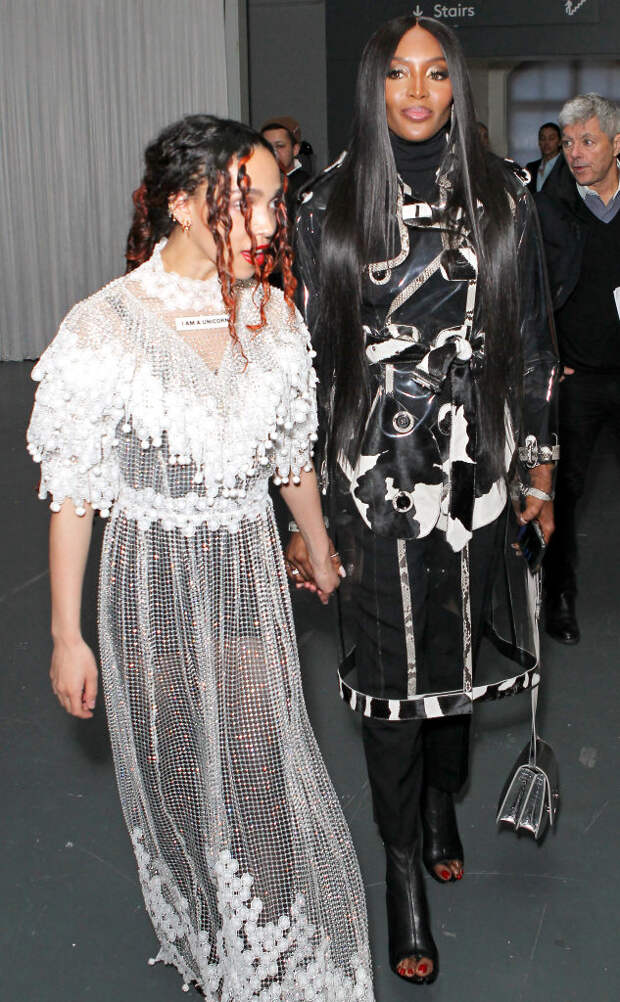 Перед показом Наоми тепло встретилась с FKA Twigs. Экс-возлюбленная Роберта Паттинсона выбрала прозрачное платье в пол из сияющих цепей и с "говорящей" надписью в районе декольте: "Я - единорог". Винни Харлоу сделала ставку на кожу. Одна из самых необычных моделей надела кремовый топ с пышными рукавами и обнаженными плечами, удачно подобрав к нему двухцветные кожаные брюки.