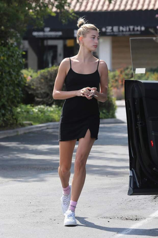Модель выбрала для прогулки платье Brandy Melville на тонких бретелях и с небольшим разрезом и надела его с белыми кедами и розовыми носками от Balenciaga. Понимаем Хейли: к таким ногам можно и нужно привлекать повышенное внимание!