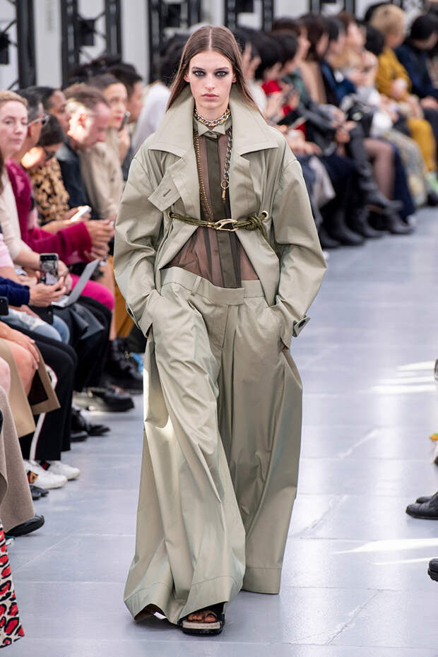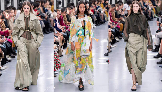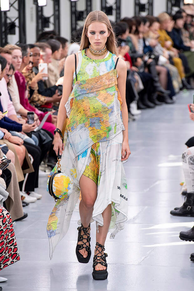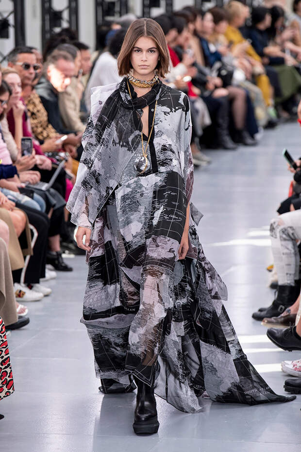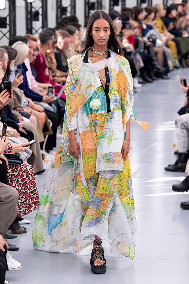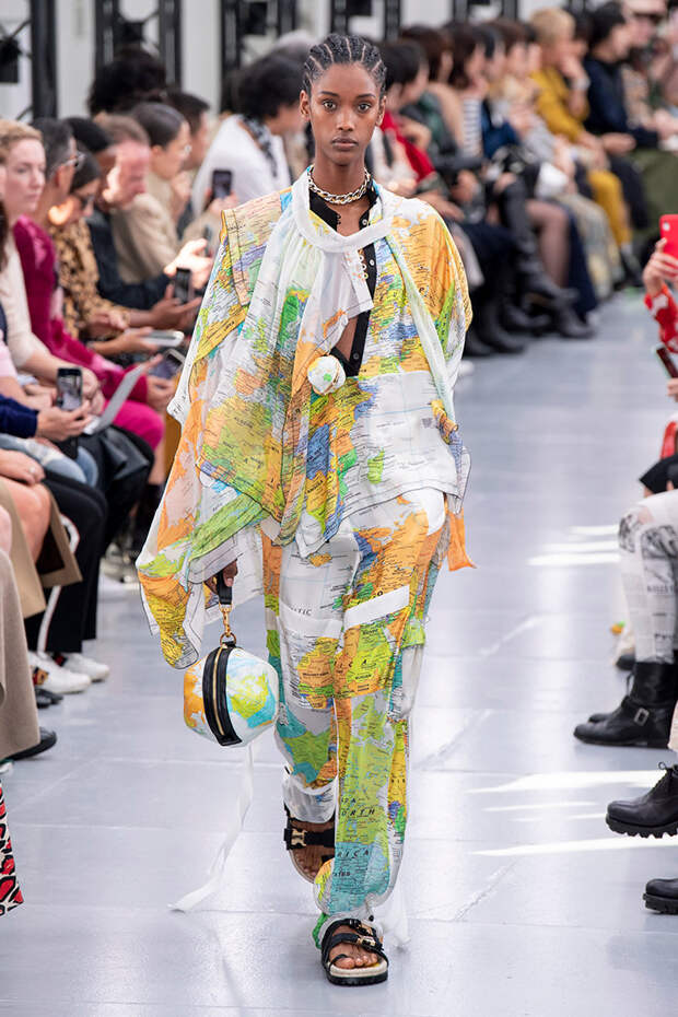 Креативный директор марки предложила, кажется, самую буквальную трактовку этой цитаты. И сшила наряды буквально из географических карт. Летящие платья-туники были покрыты ими с головы до ног, а на пальто картографические элементы расположились точечно. Особенно необычно выглядели принты, в которых те же карты были словно пропущены через фильтры Photoshop: черно-белые наряды с этим паттерном, а также вставками из твида и густой перьевой бахромы закрывали показ. Для самых же заядлых путешественниц в коллекции были еще и тематические аксессуары — массивные подвески в виде глобусов.