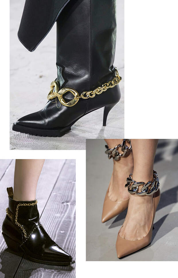 Отдельный тренд в графе “обувь с отделкой” — обувь с цепями, как тоненькими и невесомыми, так и массивными, сразу бросающимися в глаза. Украшают они любую обувь: от мюлей до космических казаков, как у Louis Vuitton.
