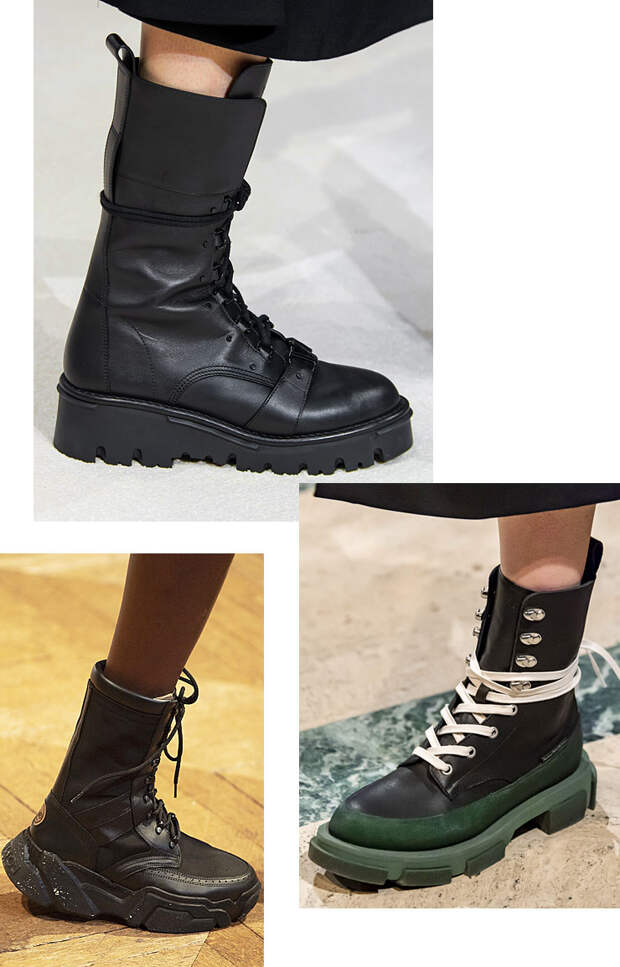 То есть просто высокие ботинки на шнуровке. Их весьма странно называть трендом, это все же скорее вечная классика. Но в осеннем сезоне вернулись к ним, представив новые версии, очень многие дизайнеры. Отдельное внимание советуем обратить на ботинки Monse — они с их нарочитой грубостью и цветными и будто покоцанными подошвами выглядят ну очень эффектно!Платформы