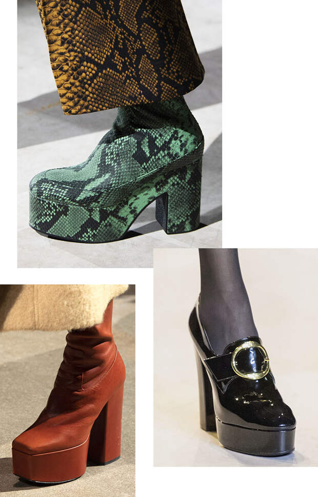 С повседневной частью мы покончили, приступаем к нарядной! Одним из главных трендов оказались массивные платформы в сочетании с таким же массивным, устойчивым каблуком — словно из 70-х. Силуэт один, а вот версии его все дизайнеры представили разные. У Celine получилась вариация не тему стиля преппи, у Dries Van Noten — нечто в духе Зигги Стардаста, ну а команда Paco Rabanne и вовсе оглядывалась в средние века, своей музой назначив Жанну Д’Арк.