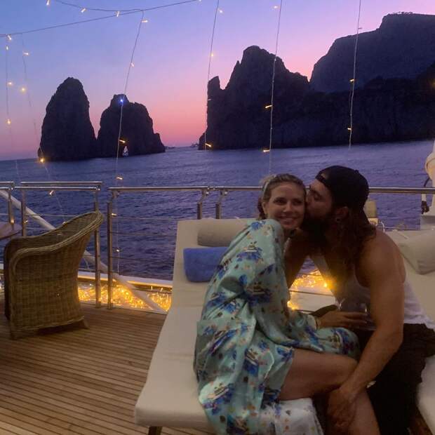 Топ-модель Хайди Клум и музыкант Том Каулитц сыграли свадьбу три недели назад, после чего отправились в медовый месяц. Сейчас звездная пара отдыхает на яхте Christina O (когда-то принадлежавшей Жаклин Кеннеди и Аристотелю Онассису) вблизи острова Капри в Неаполитанском заливе. Вчера Хайди выложила у себя в Instagram несколько романтичных фото, сделанных на закате.