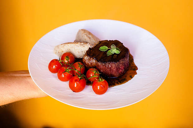Медальоны из говядины на гриле с картофельно-каштановым пюре, овощами гриль и соусом на основе сакэ
