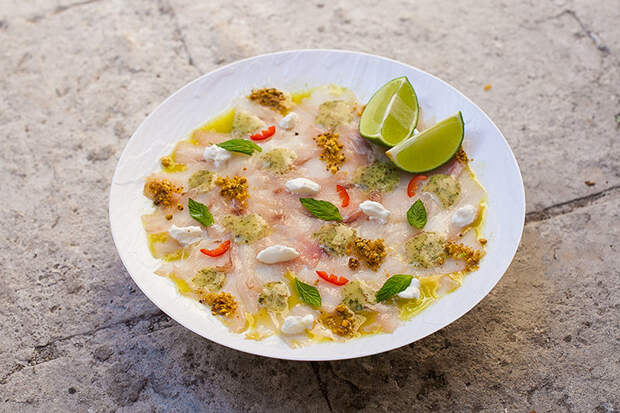 Севиче из белой рыбы с травами, белым мягким сыром и фисташками