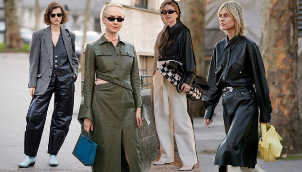 Миксуйте кожу с плотными материалами вроде твида и денима или и вовсе решитесь на тотал-лук. Сделайте ставку на однотонные вещи сдержанных цветов: черную блузку, коричневый тренч или платье цвета хаки. Откажитесь от рокерских скинни в пользу экстремально широких брюк. Подберите белую обувь – стеганые лодочки со стальным носком или узкие полусапоги.