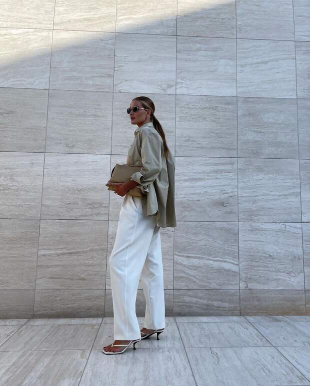 Более строгих вариантов тоже немало. Базовая модель, которая должна быть в каждом гардеробе — прямые белые брюки. В этом сезоне многие бренды заходят на территорию офисного дресс-кода и предлагают деловые модели со стрелками. Если вы не знаете, как одеться на работу в жару, эта модель станет настоящим спасением. Еще один фасон, который просто нельзя не упомянуть — брюки-палаццо. Такая вещь станет отличным компаньоном как шелковой блузы с бантом, так и рубашки мужского кроя. А в повседневном луке белые брюки-палаццо отлично дополнят даже самый дерзкий и раскованный верх: от блузы с завязками до откровенного боди.