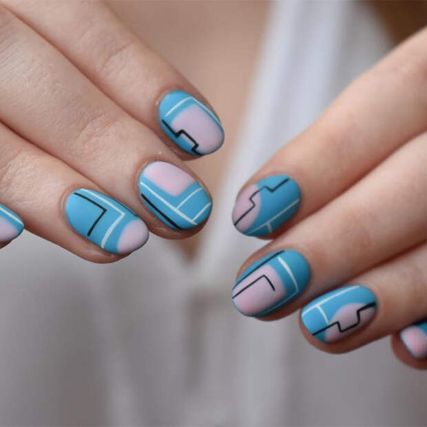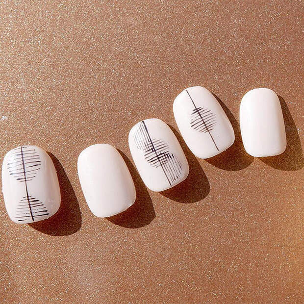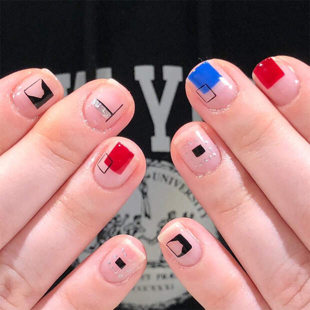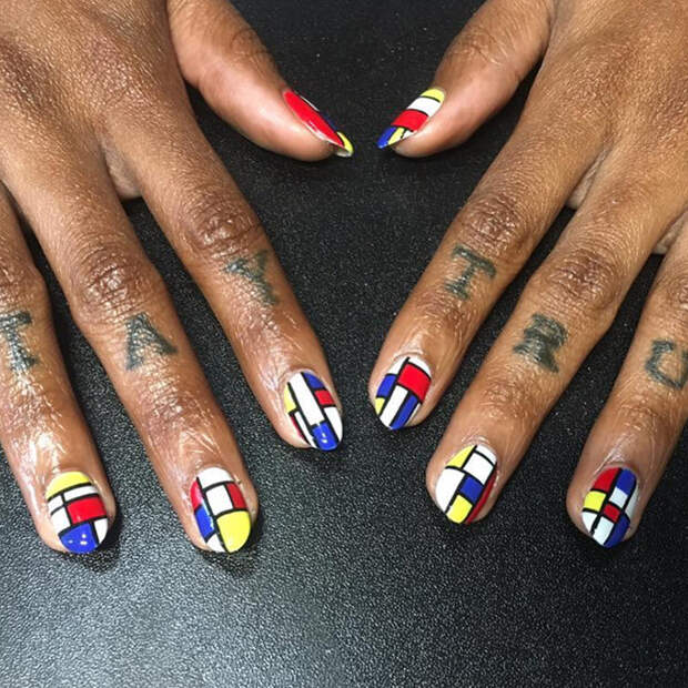 Поклонникам супрематизма посвящается. На самом деле не обязательно повторять известные произведения искусства, ведь в конце концов некоторые из копий (будь то на ногтях, футболках или тетрадях) смотрятся китчево. Достаточно попросить мастера сделать рисунок из ровных линий или геометрических фигур.