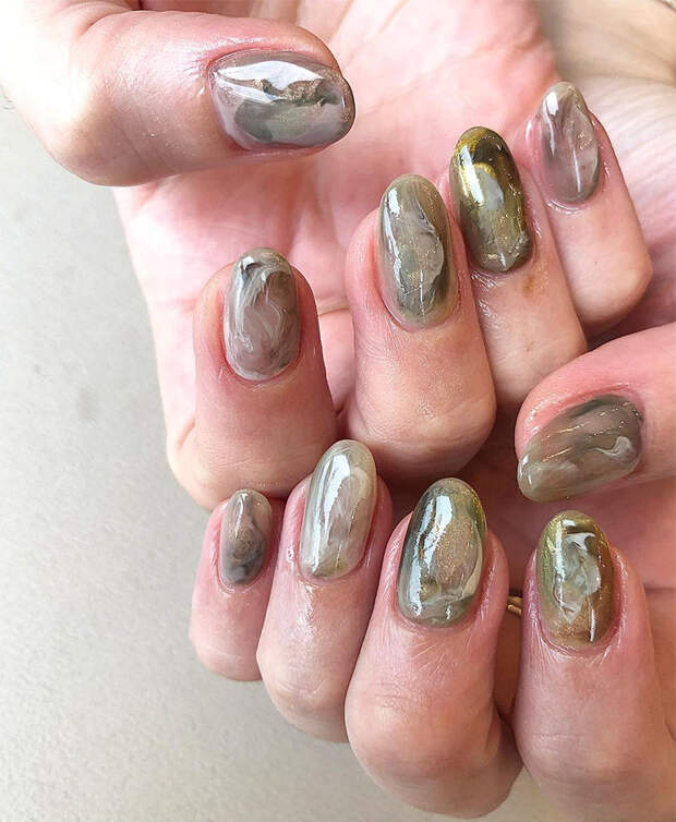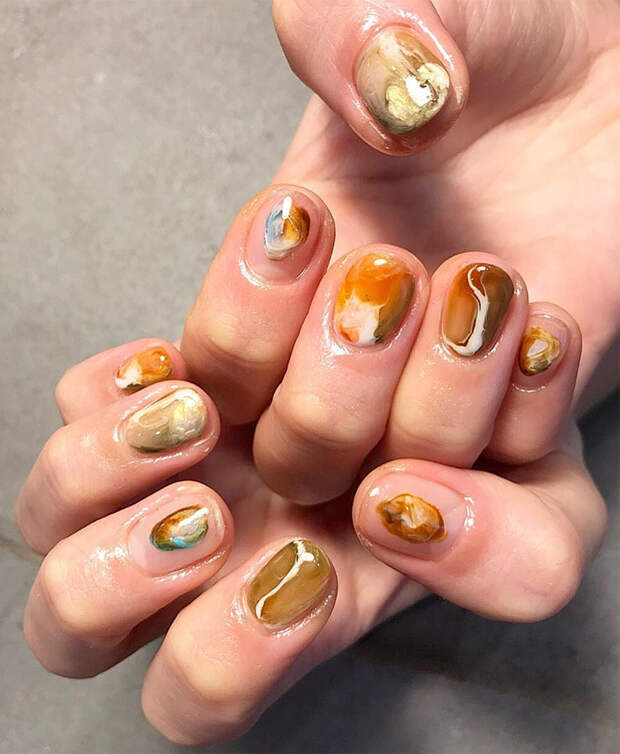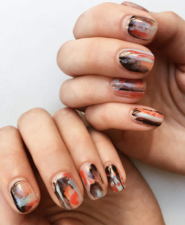 Если вам нравятся палитры художников, где цвета сочетаются хаотично, но при этом красиво и завораживающе, то такой маникюр точно придется по душе. Он напоминает неряшливо разлитые, текучие краски, которые соединяются вместе в случайном абстрактном рисунке.