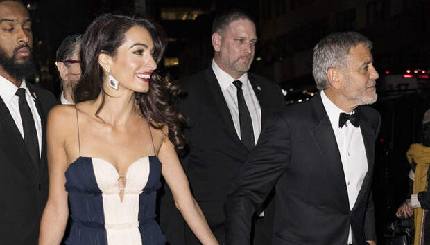 Давно мы не любовались на Амаль Клуни, а уж тем более когда она выходит в свет вместе со звездным супругом. И вот влюбленные решили побаловать нас новым совместным выходом: Джордж подержал Амаль на церемонии вручения премий от Ассоциации корреспондентов ООН. Успехи правозащитницы Клуни были отмечены в номинации "Гражданин мира", и наша героиня отправилась за наградой в темно-синем струящемся платье с контрастной белой вставкой на тонких бретелях.