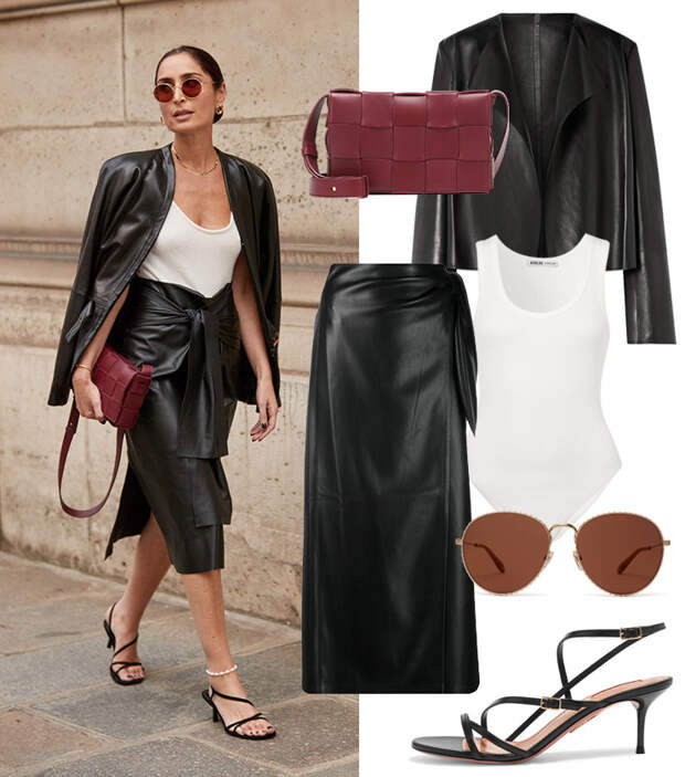 Жакет THE ROW, 260 121 руб.; юбка NANUSHKA, 24 413 руб.; боди AGOLDE, 4 299 руб.; сумка BOTTEGA VENETA, 103 666 руб.; босоножки AQUAZZURA, 32 564 руб.; очки GIVENCHY, 14 724 руб.