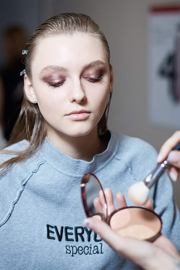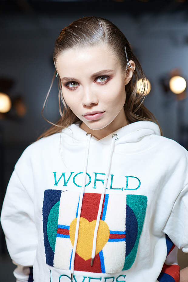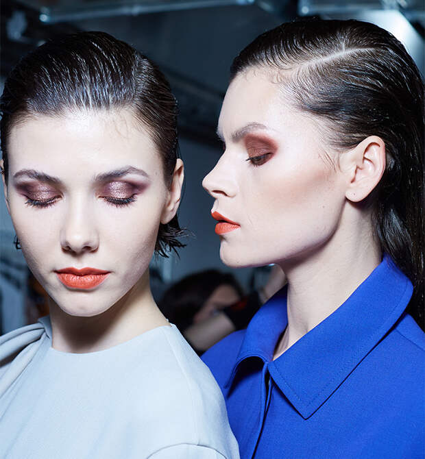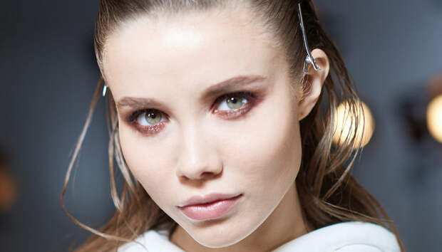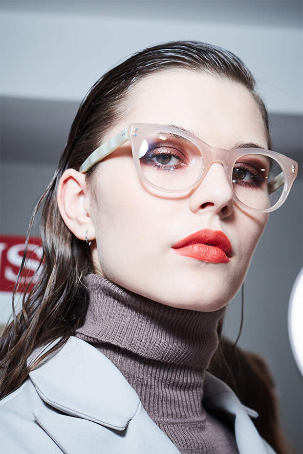 На губах "горит" коралловый цвет, перекликающийся с коллекцией дизайнера. "Макияж балансирует на грани монохром и раскрывает всю глубину гаммы теплых оттенков", - объяснила задумку Ольга Комракова, международный визажист французской марки.