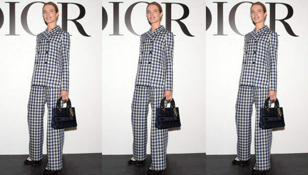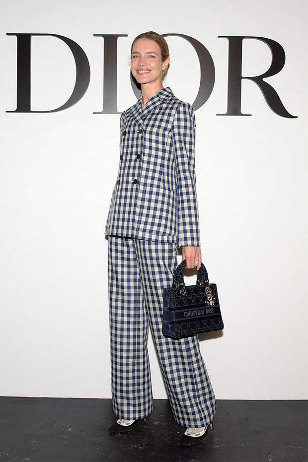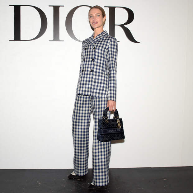 На показе Dior Водянова появилась в строгом образе. Модель надела светлый брючный костюм в темную клетку виши — состоящий из классического двубортного жакета и прямых брюк в пол. Дополнили образ лодочки на каблуке и сумка Dior на коротких ручках. На показе Наталья Водянова появилась с естественным макияжем, а в качестве укладки модель сделала лаконичный пучок.