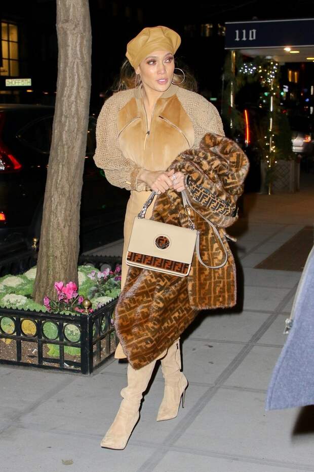А третьим выходом Лопес покорила поклонников, когда отправилась на свидание с бойфрендом Алексом Родригесом в образе в коричнево-бежевой палитре: бомбере с объемными рукавами, юбке-карандаше, замшевых сапогах на шпильках и кожаном берете, прихватив с собой легкую шубу и сумку Fendi.