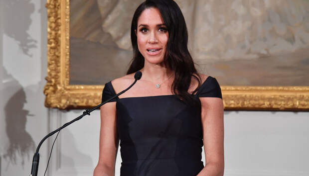 Для торжественного мероприятия Меган выбрала по-королевски роскошное атласное платье американское бренда Gabriela Hearst . Минималистичный клатч, босоножки на каблуке серьги и цепочка с кулоном дополнили вечерний образ беременной герцогини.