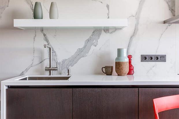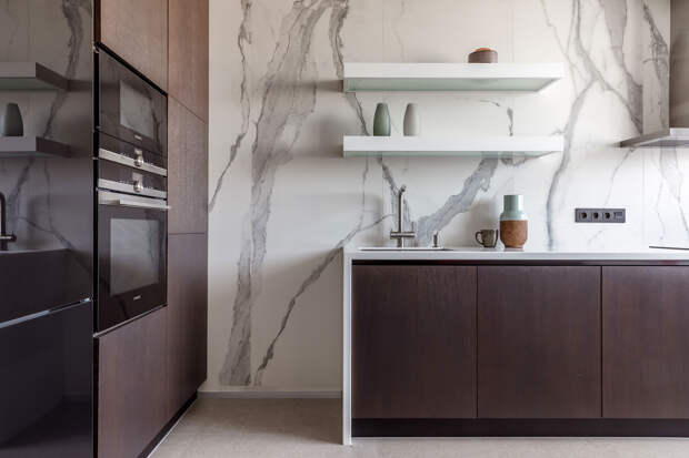 Если вам важно создать на кухне ощущение простора и открытости, откажитесь от верхних шкафов. Например, для одного из заказчиков мы оформили “воздушную” стену из широкоформатного керамогранита и убрали верхние шкафы. А многочисленные кухонные аксессуары поместились в большом, на всю высоту комнаты шкафу с множеством скрытых от глаз полок и ящичков. Если шкафов все равно не хватает и площадь позволяет, можно дополнительно разместить в кухне “остров” — стол-стойку с рабочей поверхностью и ящиками для хранения, которая устанавливается в центре комнаты.