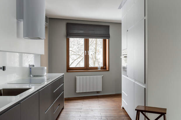 Этот дизайнерский прием визуально добавит помещению простора и организованности. Например, если у вас есть крупногабаритный холодильник, его можно гармонично вписать в минималистичный интерьер с помощью перегородки и ниши. Также можно “спрятать” духовой шкаф, посудомоечную машину или второй холодильник, если он у вас есть.