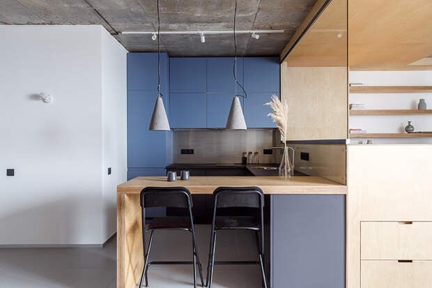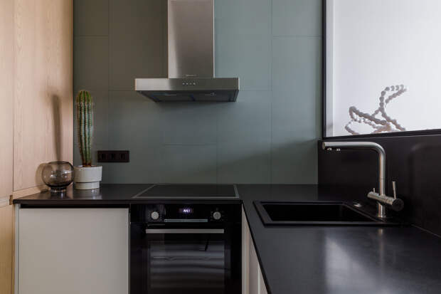 Если ваша кухня небольшая по площади, минималистичный стиль позволит сделать ее максимально функциональной и комфортной. Чтобы создать п-образную кухню на маленькой площади для нашего клиента, особое внимание мы уделили мебельной композиции, которая состоит из двух частей — встроенной и отдельной рабочей столешницы. “Остров” является встроенной частью кухни и предназначен для размещения техники и оборудования, что позволяет не загромождать открытую рабочую зону.