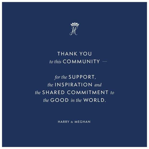 "Вы больше не увидите нас здесь, но работа продолжится. Спасибо всем вам за поддержку, вдохновение и веру в добро во всем мире", - завершили свое послание Гарри и Меган. Примечательно, что супруги подписали пост просто своими именами, уже не используя герцогские титулы.