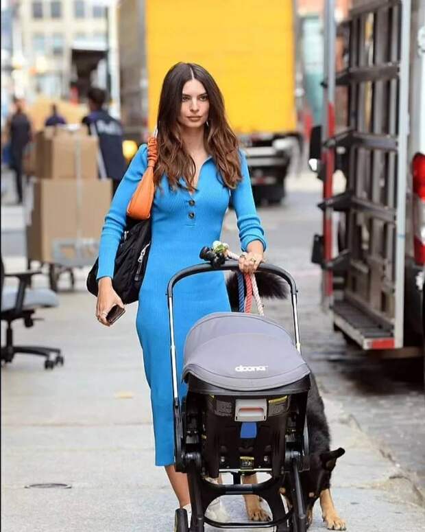 Небесно-голубого цвета, в длине макси, с застежкой и воротником поло — модель собрала буквально все тренды сезона в одной единственной вещи. Носить такое платье можно с чем угодно — от удобных кроссовок до головокружительных шпилек. Ратаковски предпочла классические белые кеды (все-таки она отправилась на прогулку с ребенком, а не на красную ковровую дорожку) и ярко-оранжевую миниатюрную сумочку-багет.