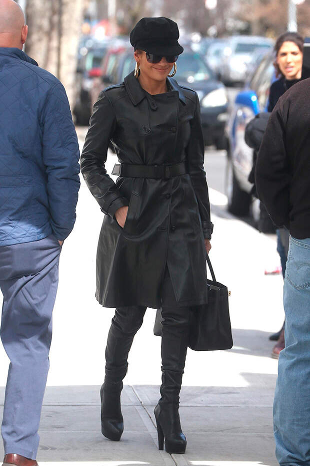 Звезда как всегда была на высоких каблуках с платформой. К ботфортам она добавила тренч из матовой кожи и кепи из того же материала. Серьги-хулахупы, любимая сумка Hermes Birkin и большие очки завершили комплект.