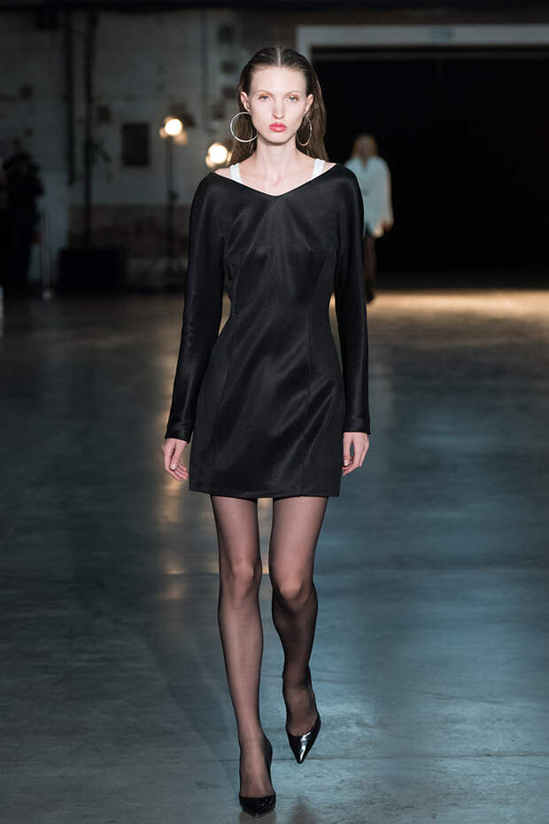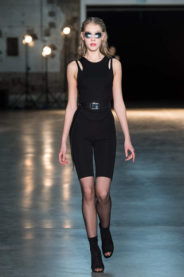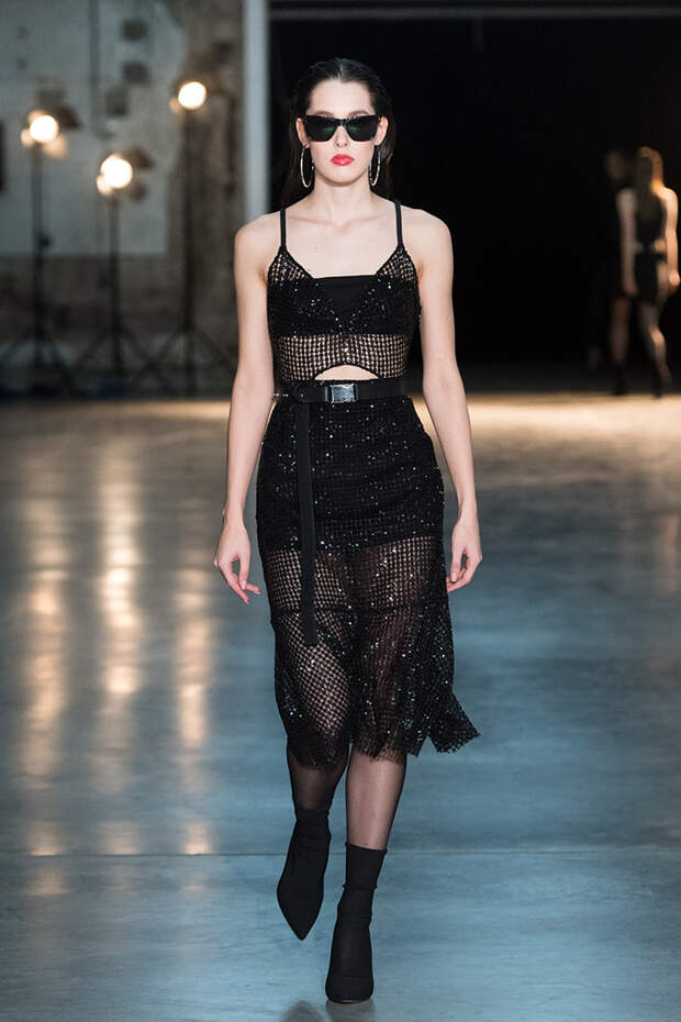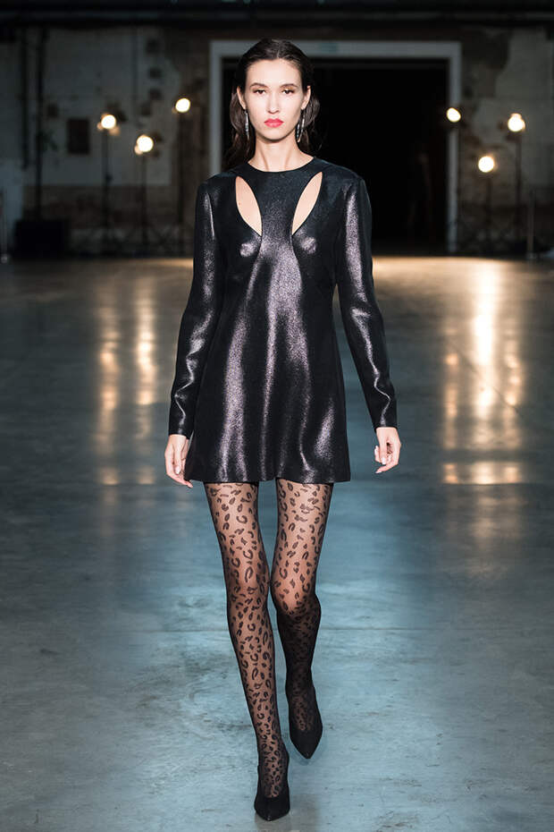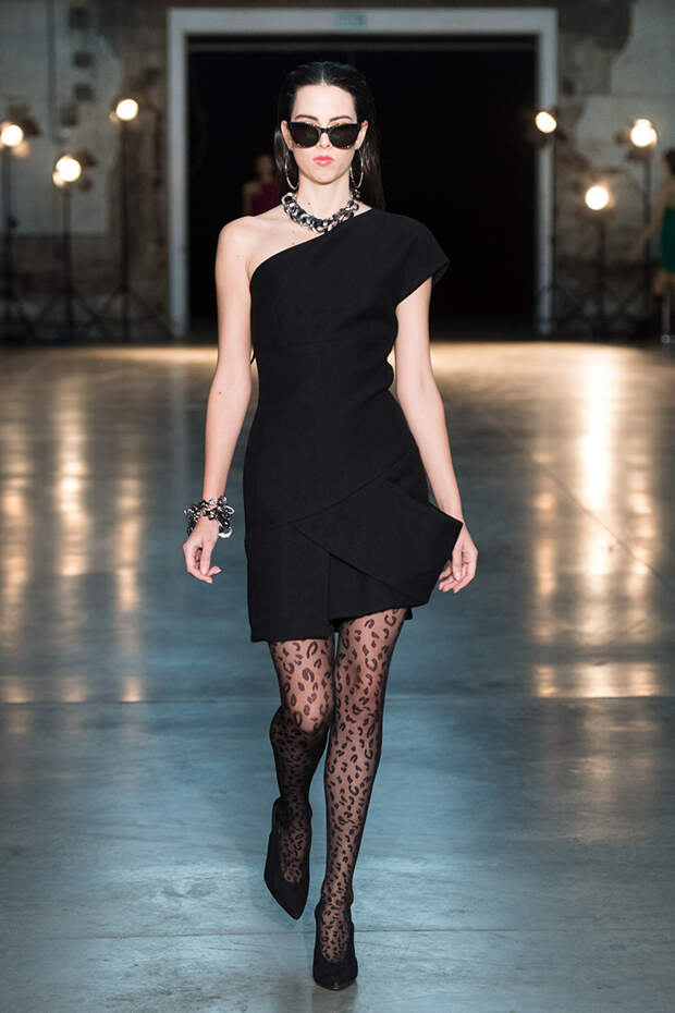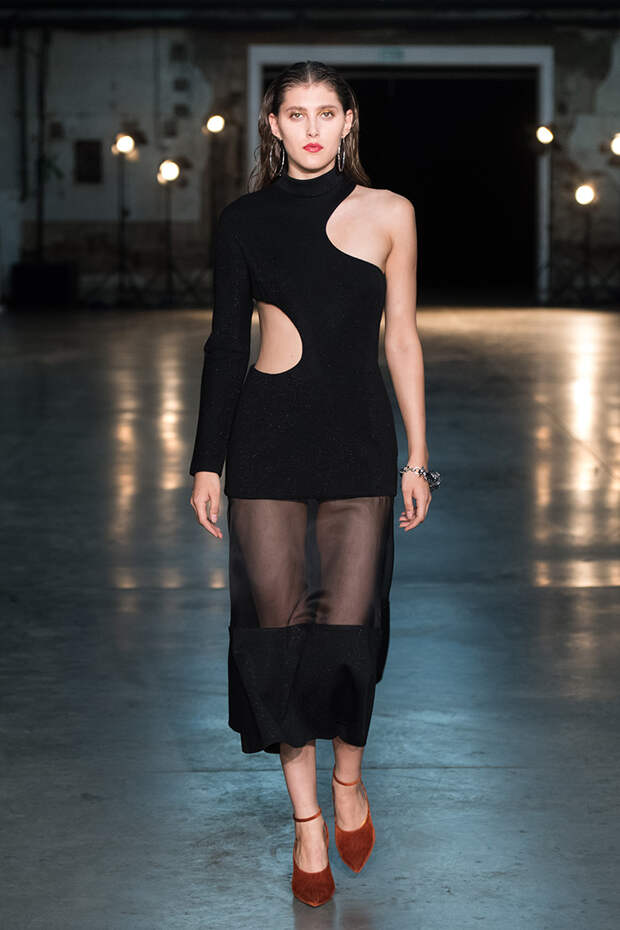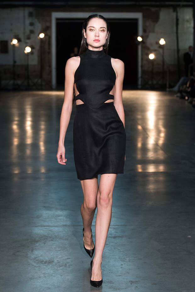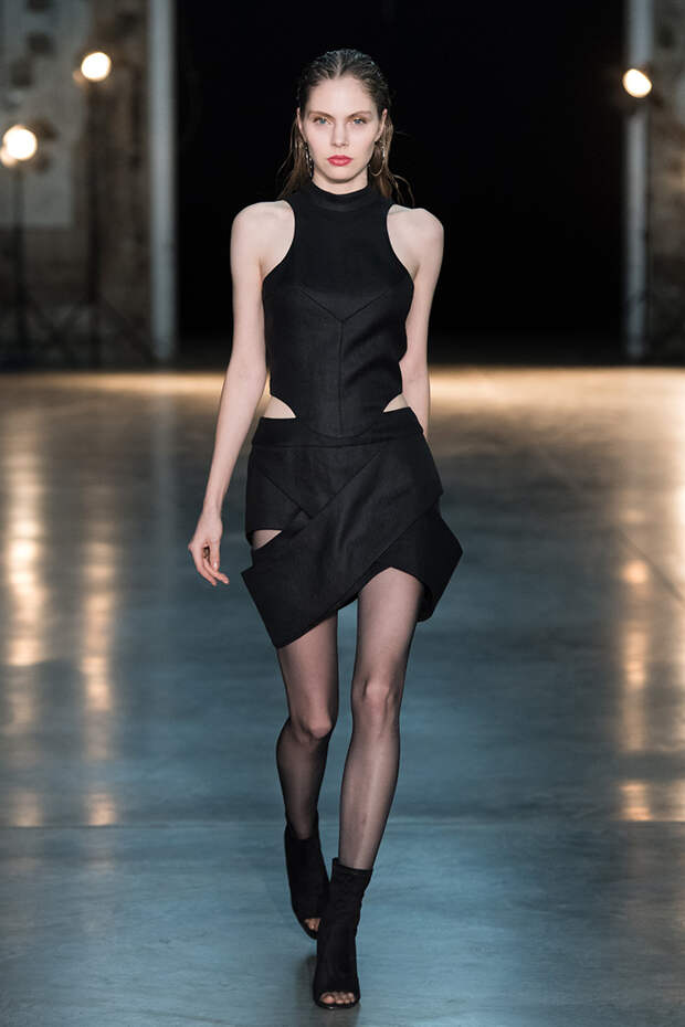 Привычная геометрия вещей меняется с помощью драпировок, сложных складок и асимметрии. Ключевые в коллекции — черные платья с плавными линиями, неожиданными вырезами и вставками. Кроме того, в нее вклинились подчеркивающие фигуру боди, эластичные лямки, мини-шорты и топы на молнии. В общем, идеальные наряды для стилизованного под то непростое время фильма.