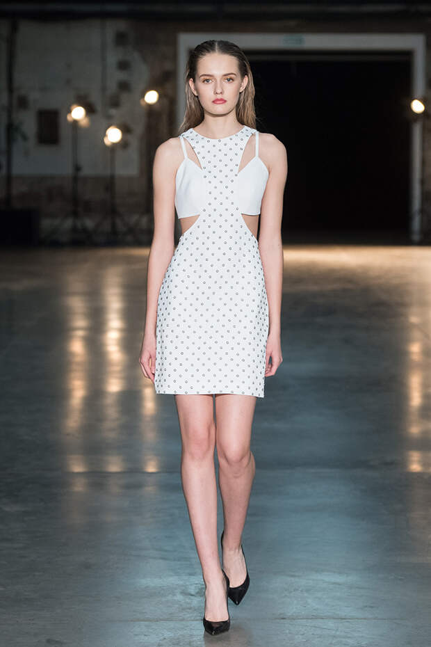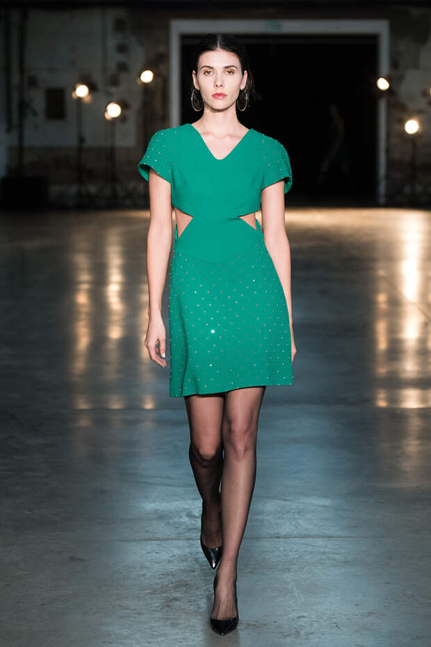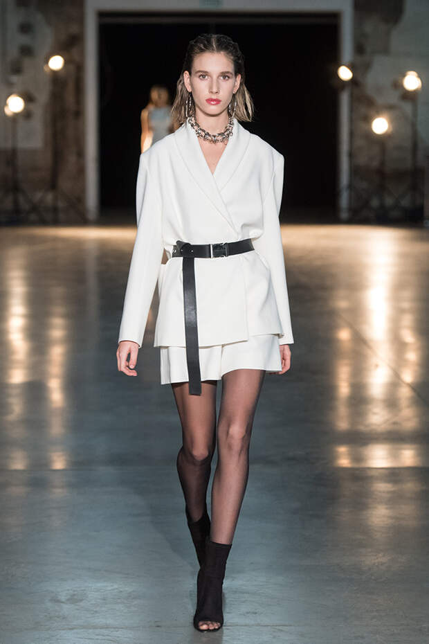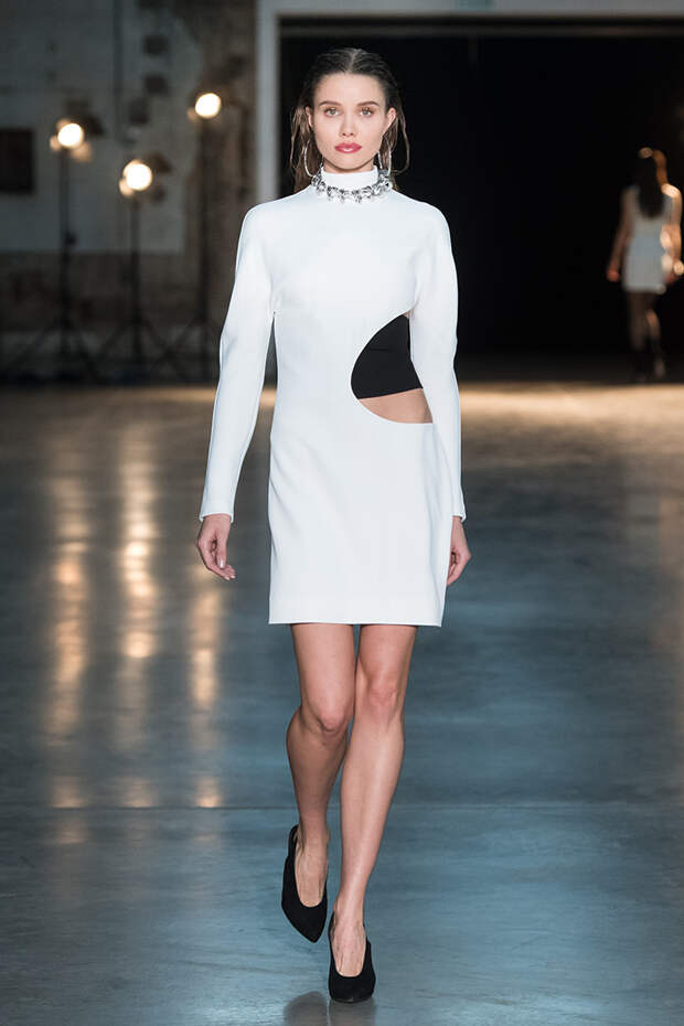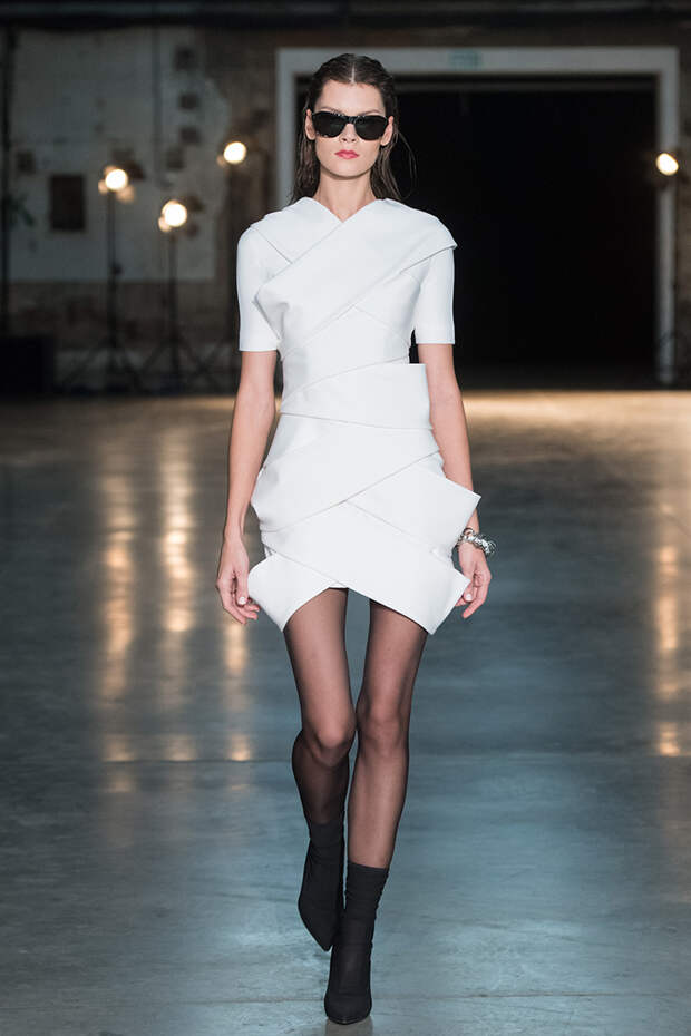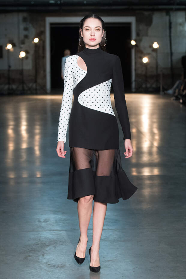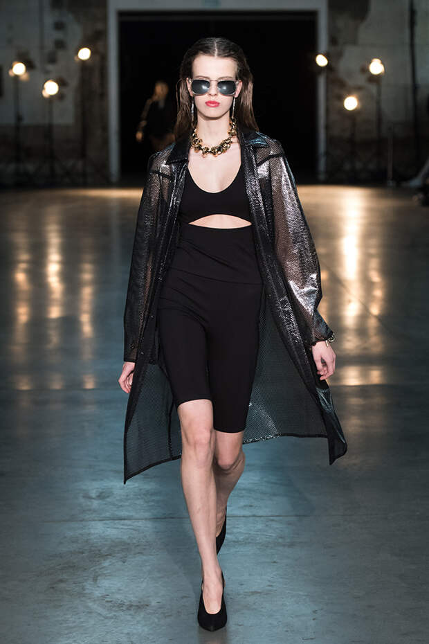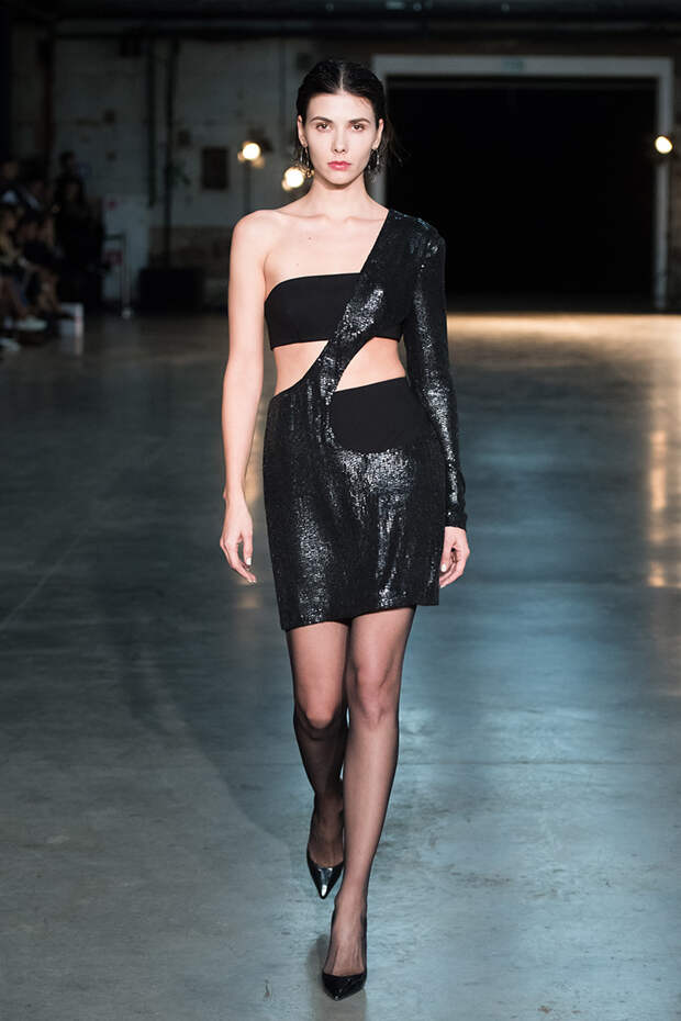 Привычная геометрия вещей меняется с помощью драпировок, сложных складок и асимметрии. Ключевые в коллекции — черные платья с плавными линиями, неожиданными вырезами и вставками. Кроме того, в нее вклинились подчеркивающие фигуру боди, эластичные лямки, мини-шорты и топы на молнии. В общем, идеальные наряды для стилизованного под то непростое время фильма.