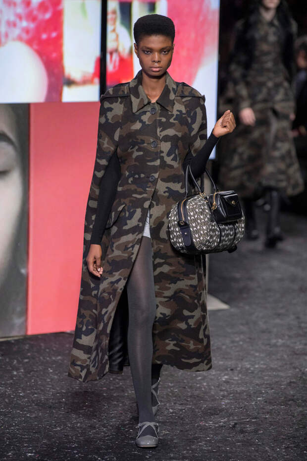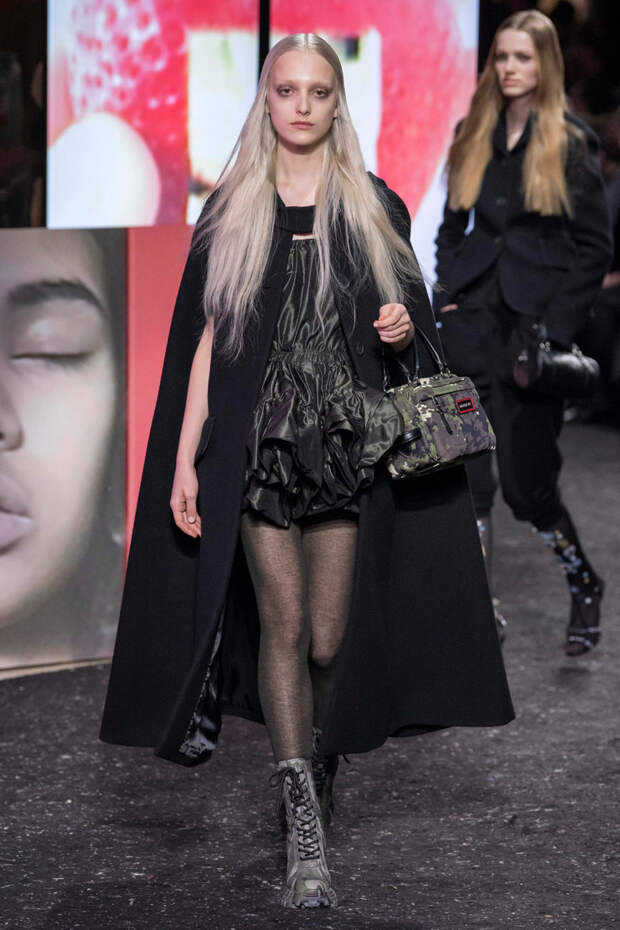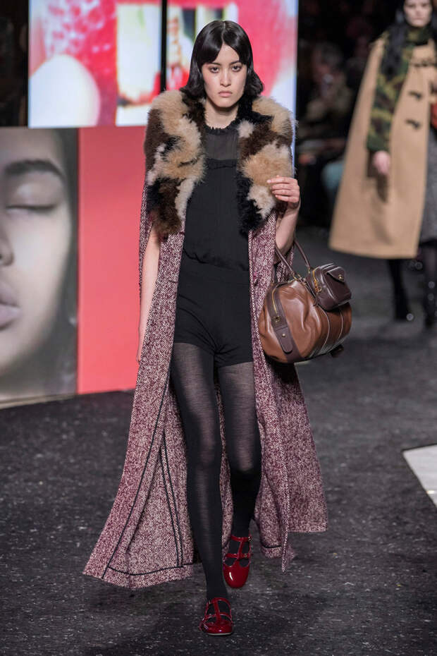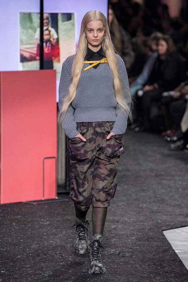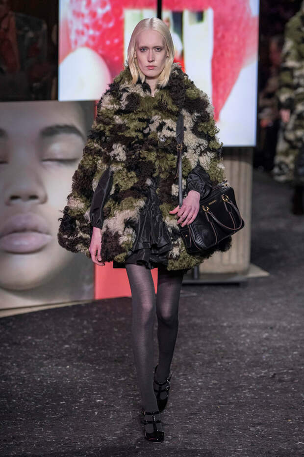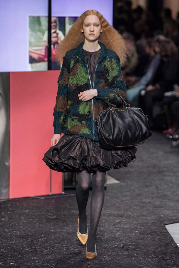 Определить, какой именно временной период стал основным для Миуччи Прады в работе над осенне-зимней коллекцией Miu Miu, вряд ли возможно - на подиуме столкнулись самые разные течения: гранж 90-х "подружился" с расслабленностью 70-х, мрачные сказочные наряды из категории "когда-то давным-давно" — с брутальным стритвировским камуфляжем.