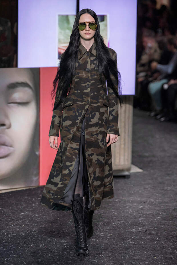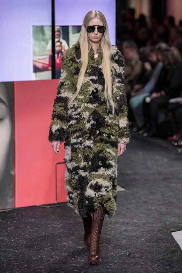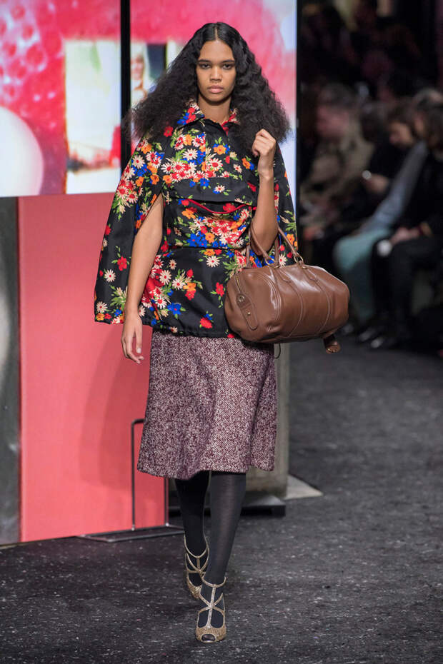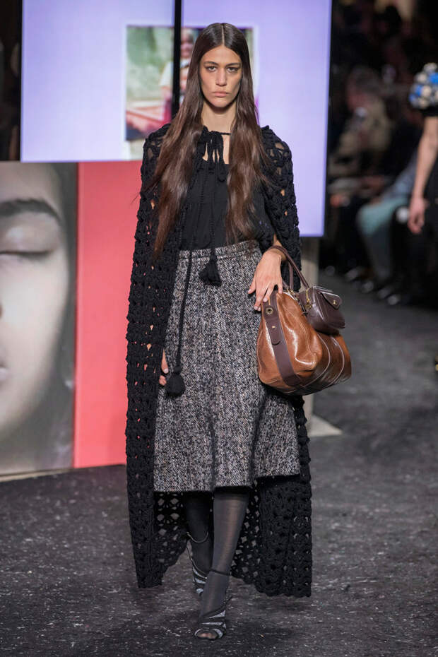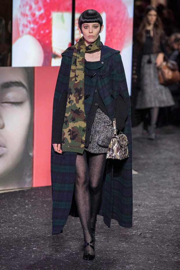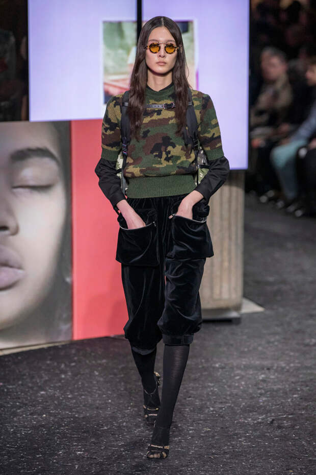 Определить, какой именно временной период стал основным для Миуччи Прады в работе над осенне-зимней коллекцией Miu Miu, вряд ли возможно - на подиуме столкнулись самые разные течения: гранж 90-х "подружился" с расслабленностью 70-х, мрачные сказочные наряды из категории "когда-то давным-давно" — с брутальным стритвировским камуфляжем.