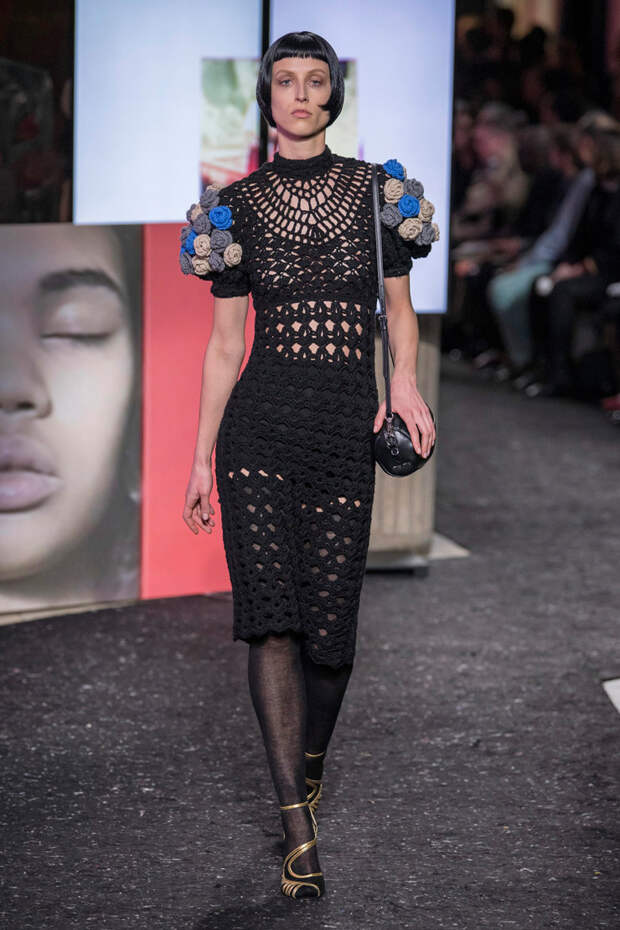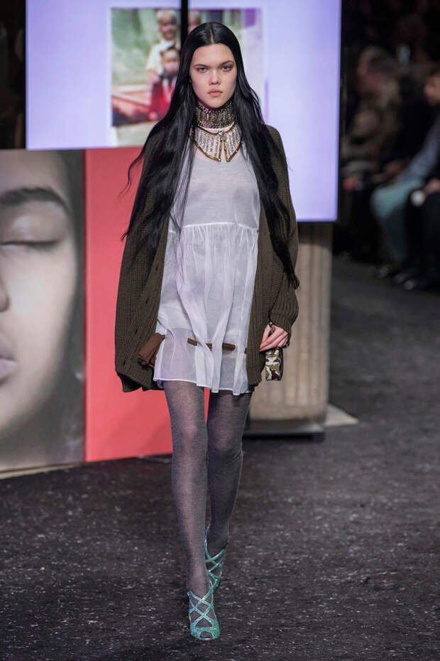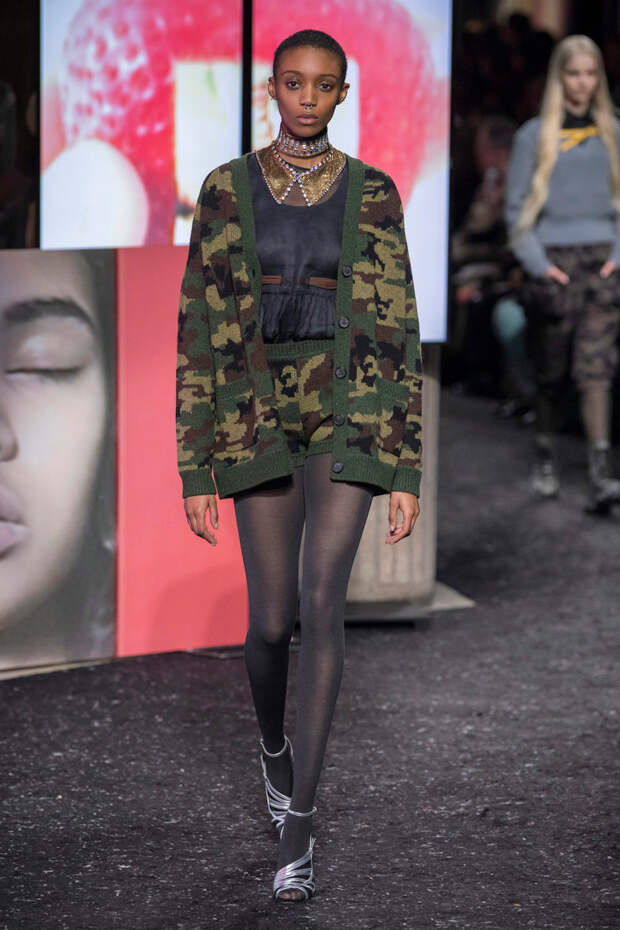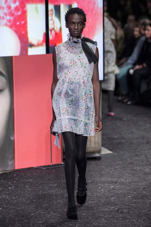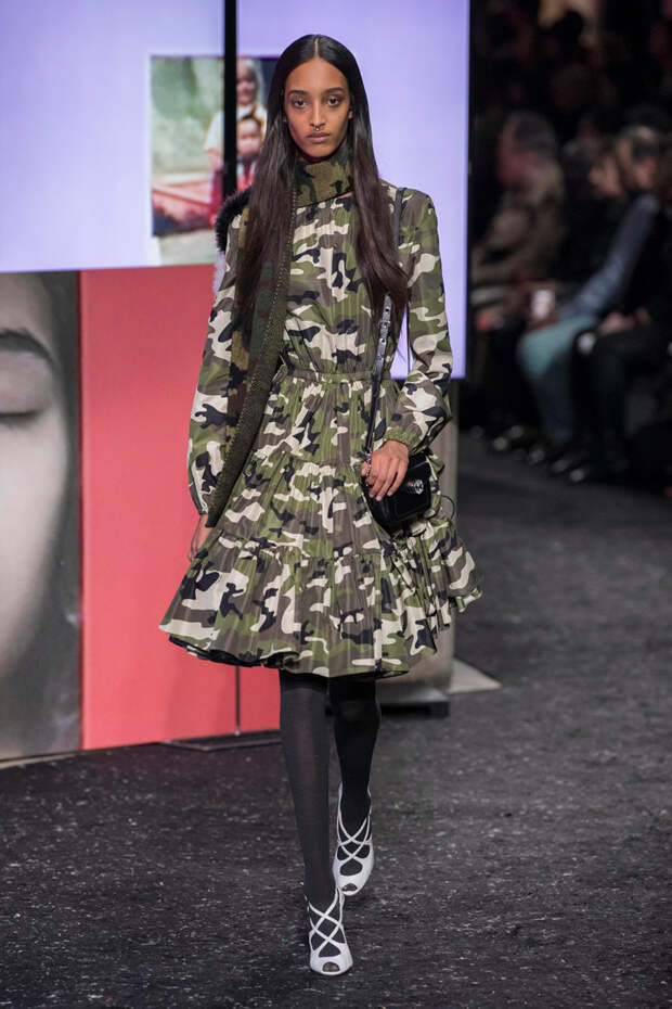 Но так ли на самом деле важно загонять коллекцию в рамки, пусть и временные? Обаяние этого сезона — как раз в сочетании несочетаемого.Здесь есть вещи кукольные, невинные, а есть нарочито взрослые, даже порочные. Вот девушка вышагивает по подиуму в пышных шортиках, как у юного пажа, — а вот марширует в ботинках на угрожающих платформах, четко печатая шаг. Вот героиня в кейпе, похожая на принцессу, заплутавшую в пугающем темном лесу, — а вот девица в бельевой комбинации, сбежавшая из родительского дома через окно, чтобы попасть на запретную вечеринку. Вот черные полупрозрачные чулки виднеются через прозрачную юбку — а вот военные брюки защитной расцветки закатаны по колено, руки в карманах, круглый воротничок, ремень поверх серого школьного свитера.