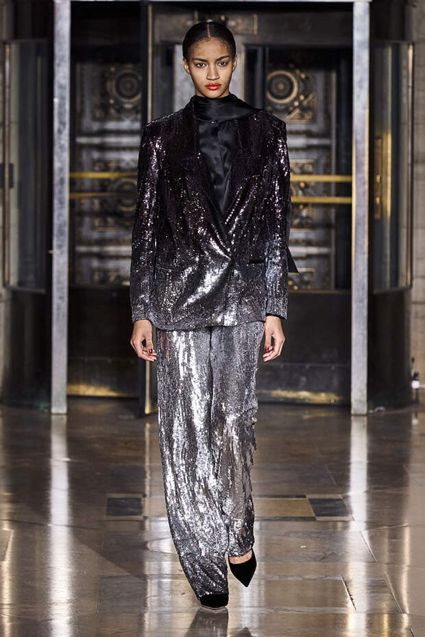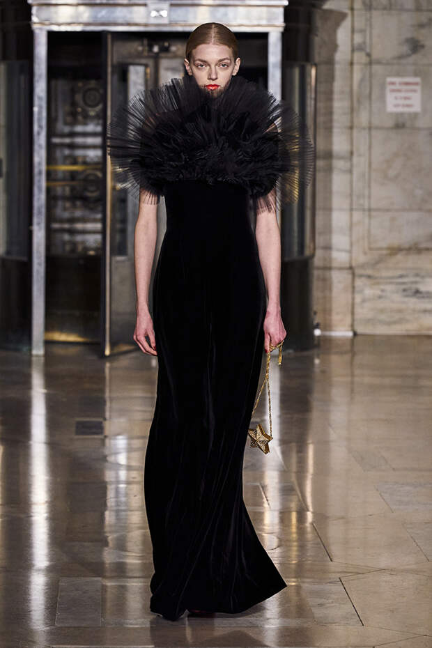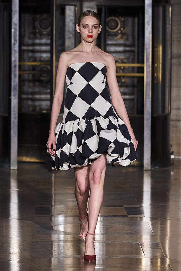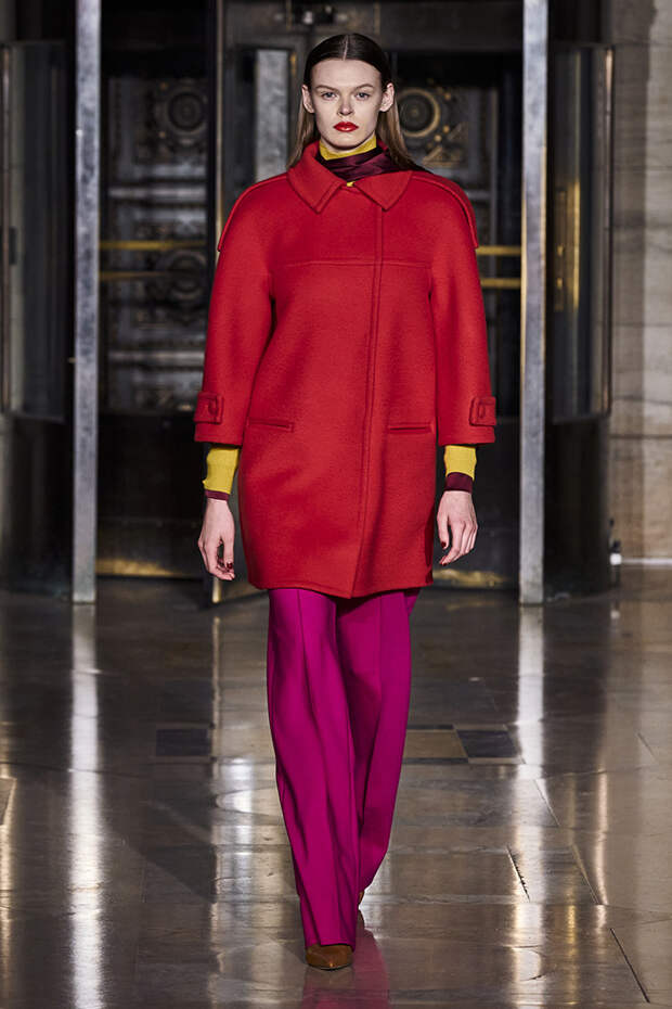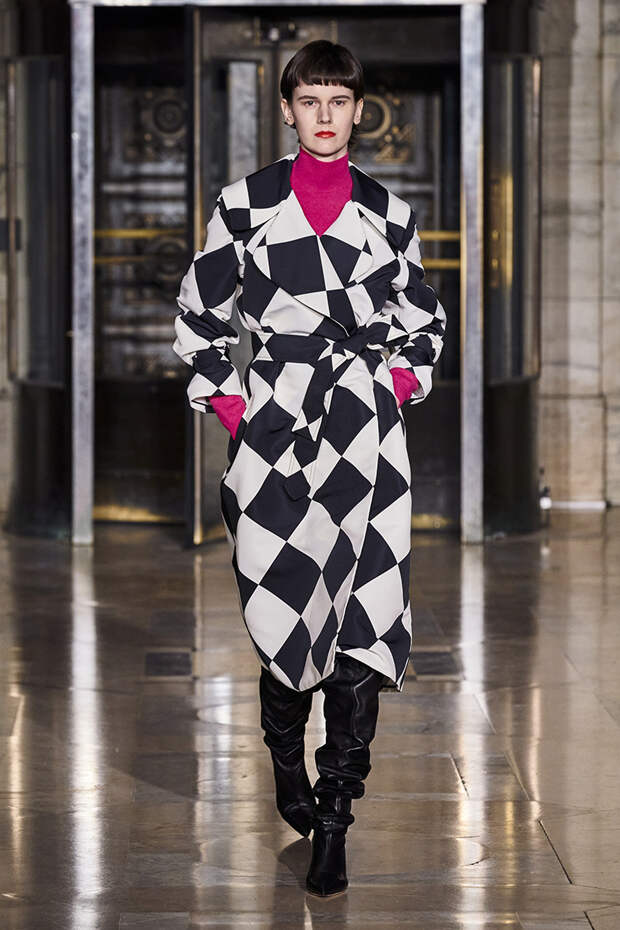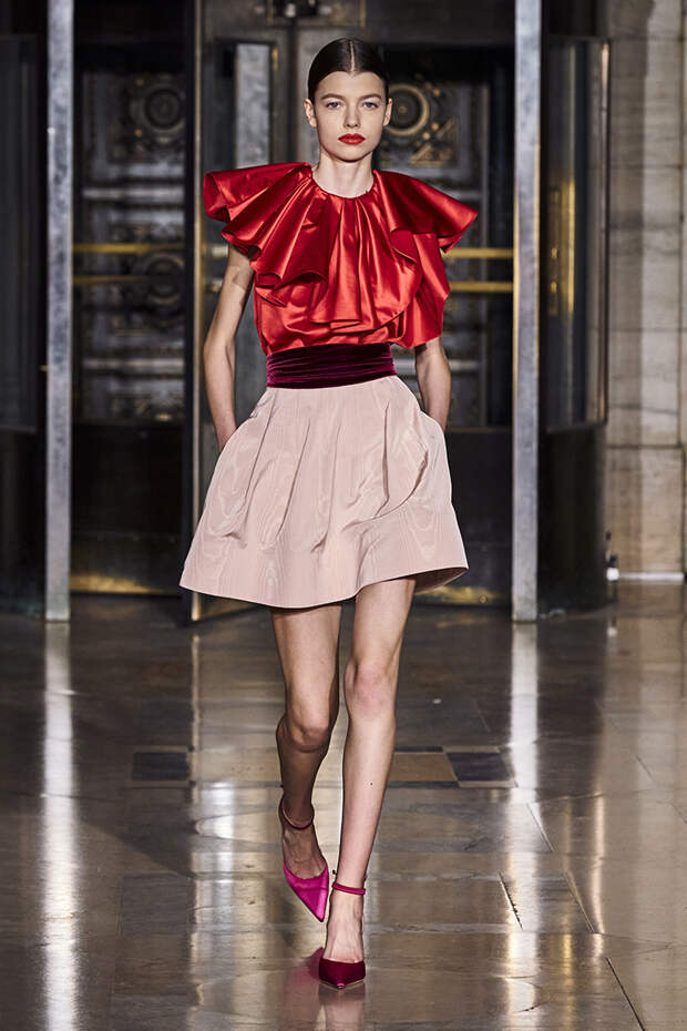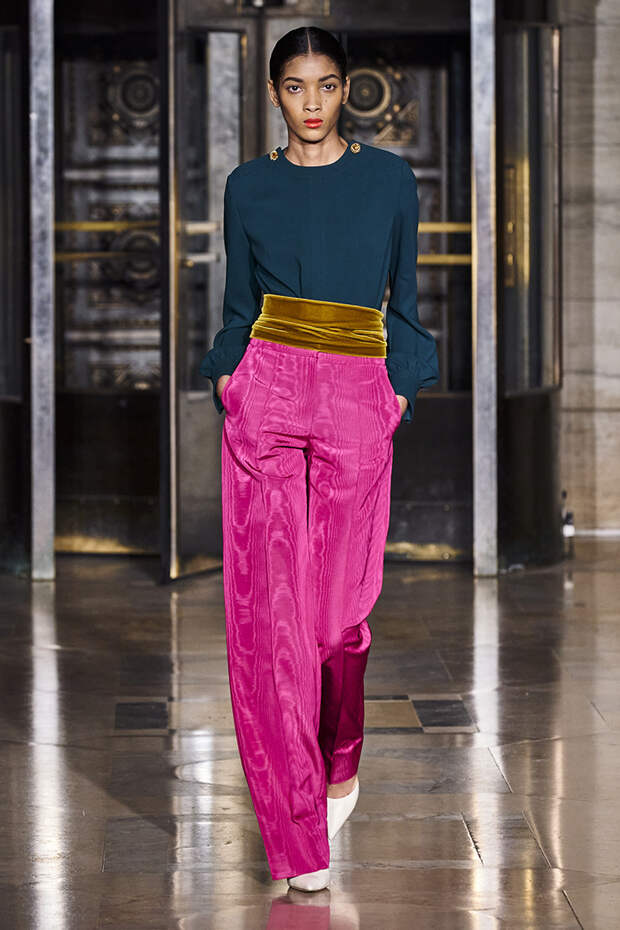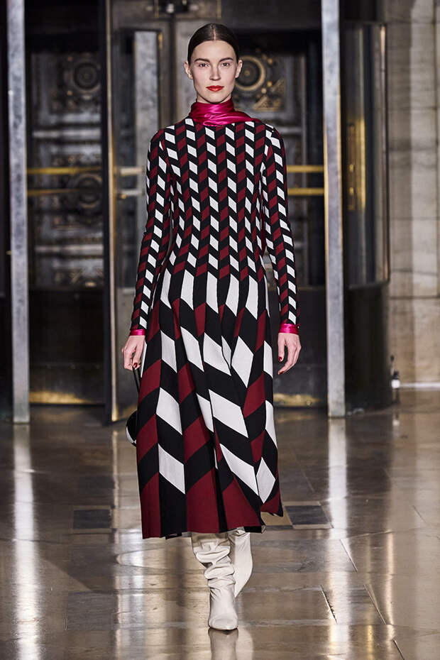 Делайте пометки, сторонники монохрома: красный — с фуксией и желтым, розовый — с бирюзовым, голубой — с красным. Это и стало главным приемом повседневной части коллекции. К нарядам скромных тонов, например, серому костюму или простому черному платью, тоже подбирались неожиданные цветные акценты — где-то из ворота неодиданно появлялся красный воротничков водолазки, где-то из рукавов показывались салатовые манжеты.В вечерней же части (а она вышла в несколько раз больше) контрасты отошли в сторону — когда начинается праздник, становится не до упражнения по колористике. Именно черно-белых нарядов, несмотря на заявленные референсы, в ней, что забавно, не было совсем — разве что пара платьев с размашистыми цирковыми ромбами, и на этом все.
