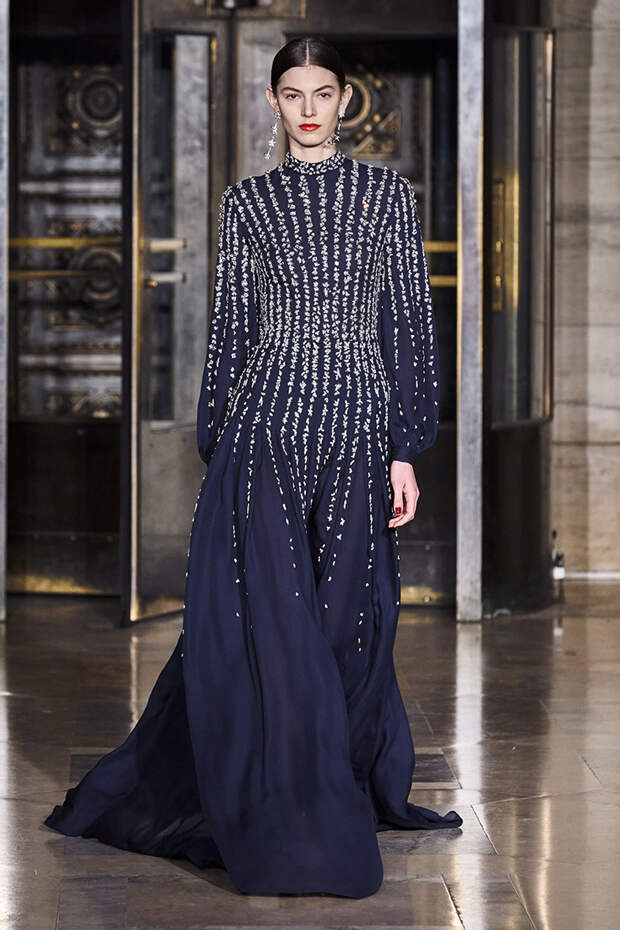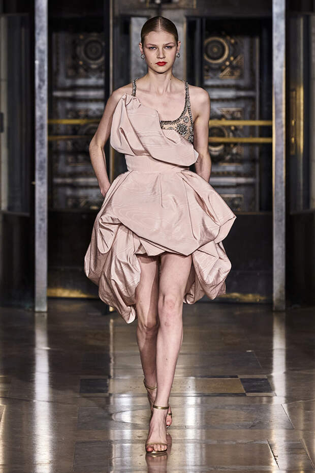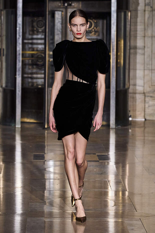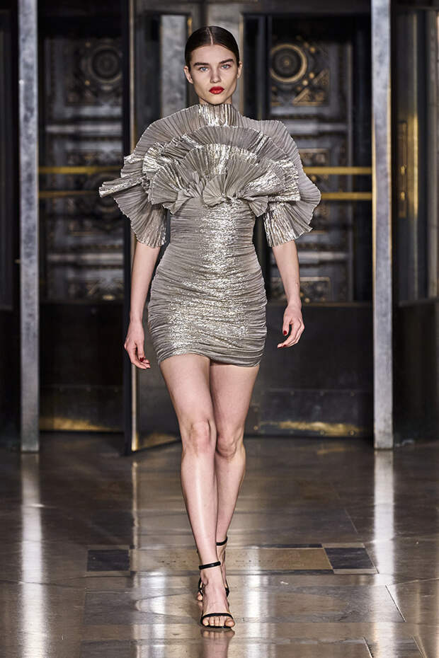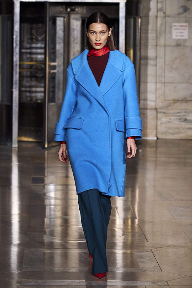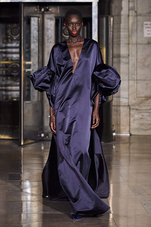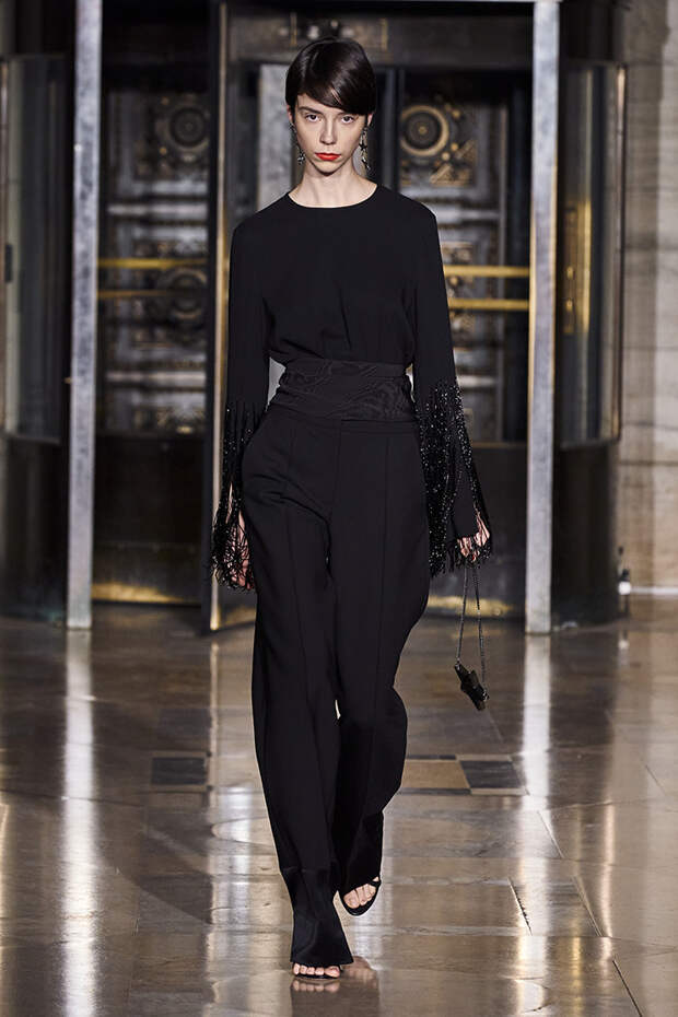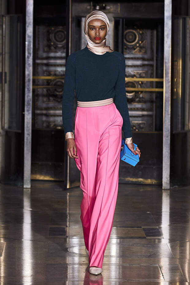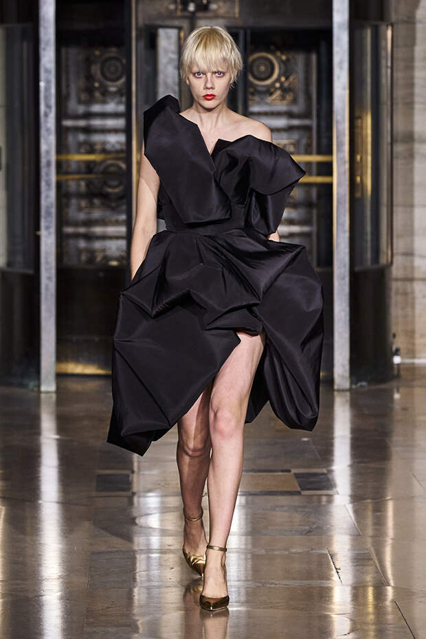Делайте пометки, сторонники монохрома: красный — с фуксией и желтым, розовый — с бирюзовым, голубой — с красным. Это и стало главным приемом повседневной части коллекции. К нарядам скромных тонов, например, серому костюму или простому черному платью, тоже подбирались неожиданные цветные акценты — где-то из ворота неодиданно появлялся красный воротничков водолазки, где-то из рукавов показывались салатовые манжеты.В вечерней же части (а она вышла в несколько раз больше) контрасты отошли в сторону — когда начинается праздник, становится не до упражнения по колористике. Именно черно-белых нарядов, несмотря на заявленные референсы, в ней, что забавно, не было совсем — разве что пара платьев с размашистыми цирковыми ромбами, и на этом все.